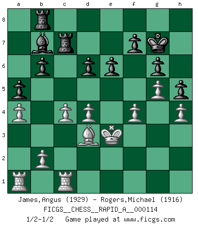 Last move : 1/2-1/2 2011 November 6 16:41:21 [Event "FICGS__CHESS__RAPID_A__000114"] [Site "FICGS"] [Date "2011.09.09"] [Round "1"] [White "James,Angus"] [Black "Rogers,Michael"] [Result "1/2-1/2"] [WhiteElo "1929"] [BlackElo "1916"] 1.e4 e6 2.d4 d5 3.Nd2 dxe4 4.Nxe4 Nd7 5.Nf3 Ngf6 6.Bd3 Nxe4 7.Bxe4 Nf6 8.Bd3 Bd6 9.O-O O-O 10.Qe2 b6 11.Ne5 Bb7 12.Bg5 h6 13.Bh4 Be7 14.c3 Nd7 15.Bg3 Nxe5 16.Bxe5 Bd6 17.Rfe1 Bxe5 18.Qxe5 Qd6 19.Qxd6 cxd6 20.f4 g6 21.Kf2 Kg7 22.g4 Rh8 23.h4 h5 24.g5 Rhc8 25.a4 Rab8 26.Rec1 Rc7 27.Ke3 a5 28.c4 1/2-1/2 French : Tarrasch Kingside Castling by player White (move 9) Kingside Castling by player Black (move 9) This chess game ended in a draw. Follow this game move after move (download)Checkers is for tramps. (Paul Morphy) Ohne ihre Erfolge schmälern zu wollen würde ich sagen Petrosian, Spassky und Karpov verdanken ihre Siege ihren Trainern - Boleslavsky, Bondarevsky und Furman. (Mikhail Moiseyevich Botvinik) El ganador de una partida es aquel jugador que hace el penúltimo error. (Savielly Tartakover) Un footballeur joue avec ses pieds, parfois avec sa tête. Un joueur d'échecs ne joue qu'avec sa tête. Et quand il ne joue plus, il meurt. (Jacob Murray) The good fighters of old first put themselves beyond the possibility of defeat, and then waited for an opportunity of defeating the enemy. (Sun Tzu)