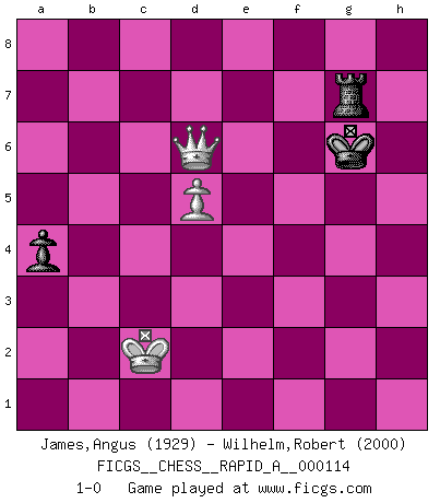 Last move : 1-0 2011 December 10 18:38:52 [Event "FICGS__CHESS__RAPID_A__000114"] [Site "FICGS"] [Date "2011.09.09"] [Round "1"] [White "James,Angus"] [Black "Wilhelm,Robert"] [Result "1-0"] [WhiteElo "1929"] [BlackElo "2000"] 1.e4 c5 2.Nf3 d6 3.d4 cxd4 4.Nxd4 Nf6 5.Nc3 a6 6.Be3 e6 7.f3 b5 8.Qd2 Nbd7 9.g4 Nb6 10.a4 Nc4 11.Bxc4 bxc4 12.g5 Nd7 13.f4 Qc7 14.O-O Bb7 15.f5 Nc5 16.fxe6 fxe6 17.Qd1 O-O-O 18.Qg4 Qd7 19.b4 cxb3 20.Nxb3 h5 21.Qe2 Nxb3 22.cxb3 Kb8 23.Qd3 Rc8 24.Qd4 Rc5 25.Rac1 e5 26.Qd1 Rc8 27.Nd5 Rxc1 28.Bxc1 Be7 29.Rf7 Bxd5 30.exd5 Rc8 31.Be3 g6 32.Qf3 Rc3 33.Kh1 Qe8 34.Rh7 Rc7 35.Qe4 Qc8 36.Rf7 Qh3 37.Rf3 Qg4 38.Qxg4 hxg4 39.Rf7 Kc8 40.Rg7 Kd7 41.Rxg6 Rc3 42.Ba7 Bf8 43.Rf6 Ke8 44.b4 Rb3 45.g6 Rxb4 46.Rf7 Be7 47.Rh7 Bf6 48.Kg2 Rxa4 49.Kg3 a5 50.Rc7 Ra3+ 51.Kxg4 Ra4+ 52.Kf3 e4+ 53.Kg4 e3 54.Kf3 e2 55.Bf2 Be5 56.h4 e1Q 57.Bxe1 Rf4+ 58.Ke2 Re4+ 59.Kd1 Rd4+ 60.Kc2 Rg4 61.h5 a4 62.Bc3 Kd8 63.Bxe5 Kxc7 64.Bf6 Kd7 65.g7 Ke8 66.h6 Kf7 67.h7 Rxg7 68.h8Q Kxf6 69.Qf8+ Kg6 70.Qxd6+ 1-0 Sicilian : Najdorf, Byrne (English) attack Kingside Castling by player White (move 14) Queenside Castling by player Black (move 17) Promotion Queen by player Black (move 56) 10 pieces endgame at move 63 : White KRBPPP , Black KRPP WHITE : King + 1 Rook 1 Bishop 3 Pawns BLACK : King + 1 Rook 2 Pawns 9 pieces endgame at move 63 : White KBPPP , Black KRPP WHITE : King + 1 Bishop 3 Pawns BLACK : King + 1 Rook 2 Pawns 8 pieces endgame at move 67 : White KBPP , Black KRPP WHITE : King + 1 Bishop 2 Pawns BLACK : King + 1 Rook 2 Pawns Promotion Queen by player White (move 68) 7 pieces endgame at move 68 : White KQP , Black KRPP WHITE : King + 1 Queen 1 Pawn BLACK : King + 1 Rook 2 Pawns 6 pieces endgame at move 70 : White KQP , Black KRP WHITE : King + 1 Queen 1 Pawn BLACK : King + 1 Rook 1 Pawn Player White won this chess game. Follow this game move after move (download)I believe that Chess possesses a magic that is also a help in advanced age. A rheumatic knee is forgotten during a game of Chess and other events can seem quite unimportant in comparison with a catastrophe on the chessboard. (Vlastimil Hort) Frage: Gibt es etwas was Sie mehr lieben als Autobahnen ohne Tempobegrenzungen? - Antwort: Deutsche Frauen ohne Tempobegrenzungen. (Loek van Wely) Aunque la mayoría de la gente disfruta observar las partidas de los grandes Maestros de ataque, algunos de los jugadores mas notables en la historia han sido los jugadores silenciosos posicionales. Lentamente ellos te aplastan despojandote de tu espacio, congestionando tus piezas y dejandote virtualmente sin nada que hacer. (Yasser Seirawan) Vouloir jouer aux échecs contre soi-même est aussi paradoxal que vouloir marcher sur son ombre. (Stefan Zweig) A government big enough to give you everything you want is strong enough to take everything you have. (Thomas Jefferson)