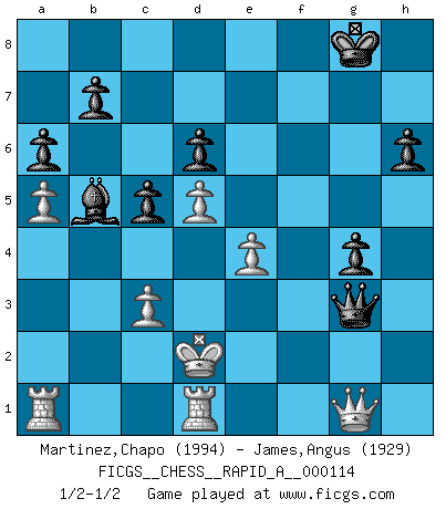 Last move : 1/2-1/2 2011 November 6 17:13:40 [Event "FICGS__CHESS__RAPID_A__000114"] [Site "FICGS"] [Date "2011.09.09"] [Round "1"] [White "Martinez,Chapo"] [Black "James,Angus"] [Result "1/2-1/2"] [WhiteElo "1994"] [BlackElo "1929"] 1.d4 Nf6 2.c4 e6 3.Nf3 c5 4.d5 exd5 5.cxd5 d6 6.Nc3 g6 7.Nd2 Bg7 8.e4 O-O 9.Be2 Re8 10.O-O Nbd7 11.a4 Ne5 12.Qc2 Qe7 13.h3 g5 14.Rd1 g4 15.hxg4 Nfxg4 16.Nf1 Qh4 17.g3 Qh3 18.Nb5 Rd8 19.Bg5 Bf6 20.Qd2 h6 21.Bxf6 Nxf6 22.Qf4 Nfg4 23.a5 a6 24.Nc3 Rf8 25.f3 f5 26.fxg4 fxg4 27.Qe3 Bd7 28.Nh2 Rf3 29.Bxf3 Nxf3+ 30.Nxf3 Qxg3+ 31.Kf1 Rf8 32.Qg1 Rxf3+ 33.Ke2 Rxc3 34.bxc3 Bb5+ 35.Kd2 1/2-1/2 Queen's pawn game Kingside Castling by player Black (move 8) Kingside Castling by player White (move 10) This chess game ended in a draw. Follow this game move after move (download)Spassky will not be psyched out by Fischer. (Mike Goodall) Heutzutage gewinnt im Turnier nicht derjenige Spieler, der weitreichende Pläne entwirft, sondern einfach jener, der Zug um Zug kämpft. (David Bronstein) El Ajedrez es imaginación. (David Bronstein) Les échecs, c'est l'imagination. (David Bronstein) Memory is a complicated thing, a relative to truth, but not its twin. (Barbara Kingsolver, Animal Dreams)