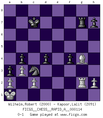 Last move : 0-1 2011 October 30 9:3:3 [Event "FICGS__CHESS__RAPID_A__000114"] [Site "FICGS"] [Date "2011.09.09"] [Round "1"] [White "Wilhelm,Robert"] [Black "Kapoor,Lalit"] [Result "0-1"] [WhiteElo "2000"] [BlackElo "2091"] 1.e4 c5 2.Nc3 Nc6 3.Nge2 e6 4.d4 cxd4 5.Nxd4 Qc7 6.f4 a6 7.Nxc6 Qxc6 8.Bd3 b5 9.Qe2 Bb7 10.Bd2 Bc5 11.O-O-O Ne7 12.Qh5 g6 13.Qh6 b4 14.Ne2 f5 15.Ng3 a5 16.Rhe1 a4 17.Kb1 O-O-O 18.b3 Qb6 19.Qg5 Rde8 20.Bc1 a3 21.Re2 Kb8 22.Qh4 Bd4 23.Nh1 Rhf8 24.Qe1 Rc8 25.Ng3 Rc7 26.Bd2 Nc6 27.exf5 gxf5 28.Nf1 Rg8 29.Be3 Bc5 30.Qd2 Ne7 31.Bc4 Be4 32.Rc1 d5 33.Bd3 Bxg2 34.Rxg2 Rxg2 35.Qxg2 Bxe3 36.Nxe3 Qxe3 37.Qg1 d4 38.Re1 Qxg1 39.Rxg1 Nd5 40.Bc4 Nc3+ 41.Ka1 Re7 42.Bd3 e5 43.Bxf5 exf4 44.Bg4 Rg7 45.Rg2 Kc7 0-1 Sicilian : chameleon variation Queenside Castling by player White (move 11) Queenside Castling by player Black (move 17) Player Black won this chess game. Follow this game move after move (download)To avoid losing a piece, many a person has lost the game. (Savielly Tartakover) Später, ... hatte ich zunehmend Erfolg in entscheidenden Partien. Vielleicht weil ich eine einfache Wahrheit erkannte: nicht nur ich hatte Angst, auch mein Gegner. (Mikhail Nekhemyevich Tal) Tu puedes aprender mucho mas de una partida que pierdas que de una partida ganada. Tendras que perder cientos de partidas antes de llegar a ser un buen jugador. (Jose Raul Capablanca) Des combinaisons [dans le jeu d'échecs] pareilles à des mélodies. Je crois entendre pour ainsi dire la musique des coups... (Vladimir Nabokov) Gambling : The sure way of getting nothing from something. (Wilson Mizner)