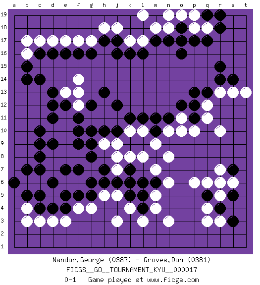 Last move : 0-1 2007 February 1 7:45:49 [Event "FICGS__GO__TOURNAMENT_KYU__000017"] [Site "FICGS"] [Date "2007.01.03"] [Round "1"] [Black "Nandor,George"] [White "Groves,Don"] [Result "0-1"] [Rating 1 "0387"] [Rating 2 "0381"] 1.q17 q3 2.d16 c3 3.d4 d3 4.e4 e3 5.c4 b4 6.c10 k4 7.k16 r10 8.r15 q6 9.c7 f17 10.g16 c17 11.c16 d17 12.e16 e17 13.f16 g17 14.h17 h18 15.j17 f4 16.c5 r13 17.q13 q12 18.p13 n3 19.p12 q11 20.p11 p10 21.f5 g4 22.g5 h5 23.h6 j5 24.j6 n10 25.n11 l10 26.l6 m5 27.m6 n6 28.j10 n8 29.l11 l17 30.l16 k17 31.d13 l8 32.m17 j18 33.j16 j8 34.g8 k10 35.k11 j9 36.h10 h9 37.g9 j7 38.k6 m7 39.b5 b3 40.r4 r3 41.r6 r7 42.q5 p6 43.s7 s6 44.m10 m9 45.m11 o11 46.o12 o10 47.l5 m4 48.l4 l3 49.k5 j3 50.r14 s13 51.s14 f6 52.g6 f8 53.f7 e6 54.e7 c6 55.d6 b6 56.b7 b16 57.b15 b17 58.c14 m18 59.n17 n18 60.o18 o17 61.o16 p18 62.p17 o19 63.o17 q18 64.r18 p19 65.k7 k8 66.r19 n19 67.q19 d8 68.f9 d7 69.a6 e8 70.e5 d10 71.d9 e9 72.c9 e11 73.d11 e10 74.e12 f12 75.f10 e13 76.d12 g11 77.c8 h11 78.f11 j11 79.g10 f14 80.g12 f13 81.j12 h12 82.h13 r5 83.s5 r6 84.s3 q4 85.h7 l19 86.b14 t13 0-1 Here are the names of the openings (joseki) played in the four corners : Corner d4 : c3 d4 San-San (Sam-Sam, San-San) 3-3 Point. The San-San (3-3) point, emphasizing territory at the expense of influence. Kata-tsuki (shoulder hit). The shoulder-hit is the traditional answer to the 3-3. The direction of White 3 depends on the positions on the side. Crawling once may be the premise for a follow-up move of sliding with a knight's move in the opposite direction. If White plays 3 at 3-4 (to the right), the follow-on knight's move is then played at the top (e.g. 3-4, 4-5, 5-2). White's knight's move reduces territory potential on the side it is played. Corner d16 : d16 f17 Hoshi (Hwajeom, Seongjeom, Xingwei`) 4-4 Point. The star or hoshi (4-4) point, emphasizing influence at the potential expense of territory. Ikken Kakari (Hankan Keolch'im, Yi Gua`jiao~, 1-Space Low Approach). White 2 is the standard approach move to the 4-4. Player White won this Go (weiqi, baduk) game. Follow this game move after move (download)Strike at the waist of the knight's move. (Anonymous) Train yourself to let go of everything you fear to lose. (Master Yoda in Star Wars ep.3)