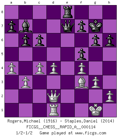 Last move : 1/2-1/2 2011 November 22 18:36:39 [Event "FICGS__CHESS__RAPID_A__000114"] [Site "FICGS"] [Date "2011.09.09"] [Round "1"] [White "Rogers,Michael"] [Black "Staples,Daniel"] [Result "1/2-1/2"] [WhiteElo "1916"] [BlackElo "2014"] 1.e4 c6 2.d4 d5 3.Nc3 dxe4 4.Nxe4 Nf6 5.Nxf6+ exf6 6.c3 Bd6 7.Bd3 O-O 8.Ne2 Re8 9.O-O g6 10.Bf4 Bg4 11.f3 Be6 12.Re1 Qc7 13.Qd2 Nd7 14.b3 Rad8 15.Rad1 Nb6 16.Bxd6 Qxd6 17.Kh1 f5 18.Nf4 Nd5 19.Nxd5 Bxd5 20.Rxe8+ Rxe8 21.c4 Be6 22.Bf1 b6 23.g3 Bc8 24.Kg1 Bb7 25.f4 Qf6 26.Be2 Kg7 27.Bf3 h6 28.a4 Qe7 1/2-1/2 Caro-Kann : Tartakower (Nimzovich) variation Kingside Castling by player Black (move 7) Kingside Castling by player White (move 9) This chess game ended in a draw. Follow this game move after move (download)Not only will I predict his triumph over Botvinnik, but I'll go further and say that he'll probably be the greatest Chess player that ever lived. (John Collins) Habe Mut, dich deines eigenen Verstandes zu bedienen. (Immanuel Kant) ¿Que sería del Ajedrez sin errores graciosos?. (Kurt Richter) Que feriez-vous si vous étiez en train de jouer aux échecs et que la fin du monde arrive ? Je continuerais à jouer. (Saint Borromée) Do not put your faith in what statistics say until you have carefully considered what they do not say. (William W. Watt)