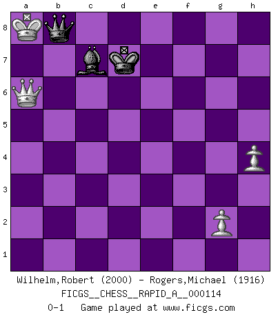 Last move : 0-1 2012 January 4 21:56:45 [Event "FICGS__CHESS__RAPID_A__000114"] [Site "FICGS"] [Date "2011.09.09"] [Round "1"] [White "Wilhelm,Robert"] [Black "Rogers,Michael"] [Result "0-1"] [WhiteElo "2000"] [BlackElo "1916"] 1.e4 e6 2.d4 d5 3.Nd2 dxe4 4.Nxe4 Nd7 5.Nf3 Ngf6 6.Bd3 Nxe4 7.Bxe4 Nf6 8.Bg5 Be7 9.Bd3 Nd5 10.Bd2 O-O 11.a3 Nf6 12.Qe2 b6 13.O-O-O Bb7 14.Kb1 c5 15.dxc5 bxc5 16.Ne5 Qc7 17.Rhe1 Rab8 18.f3 Rbd8 19.Qf2 Ba8 20.Qg3 Rd5 21.Bc3 h6 22.f4 Rfd8 23.Re3 Rd4 24.Rde1 Bd6 25.Qh4 Bd5 26.Kc1 Rb8 27.Rh3 Qb7 28.Qg3 Kf8 29.f5 Qc7 30.Bxd4 cxd4 31.fxe6 Bxe6 32.Rh4 Re8 33.Rxd4 Bd5 34.Nd7+ Qxd7 35.Rxe8+ Kxe8 36.Qxg7 Qe6 37.Kd1 Be5 38.Ra4 Qb6 39.Ke2 Qg1 40.Bc4 Bf3+ 41.Kxf3 Qd1+ 42.Be2 Qd7 43.Bb5 Qxb5 44.Qh8+ Ke7 45.Rxa7+ Nd7 46.Rxd7+ Kxd7 47.Qxh6 Qf1+ 48.Ke4 Bxb2 49.Qd2+ Ke8 50.Qg5 Qc4+ 51.Kf3 Qc6+ 52.Kg3 Qxc2 53.Qb5+ Kf8 54.a4 Bf6 55.Qb4+ Be7 56.Qb8+ Kg7 57.Qf4 Qd3+ 58.Kf2 Bc5+ 59.Ke1 Qd5 60.h3 Bd6 61.Qg4+ Kf8 62.Qh4 Qe6+ 63.Kf1 Qf5+ 64.Ke2 Qg6 65.Qh8+ Ke7 66.Qa8 Qc2+ 67.Ke3 Bc5+ 68.Kf4 Qd2+ 69.Kf5 Qd7+ 70.Ke4 f5+ 71.Kf4 Qe6 72.h4 Bd6+ 73.Kf3 Qb3+ 74.Ke2 Qc4+ 75.Kd2 Bb4+ 76.Ke3 Qc3+ 77.Ke2 Qe1+ 78.Kf3 Qd1+ 79.Kf4 Bd6+ 80.Kxf5 Qh5+ 81.Ke4 Qe2+ 82.Kd4 Be5+ 83.Kc5 Qc2+ 84.Kb4 Bd6+ 85.Kb5 Qc5+ 86.Ka6 Qc4+ 87.Kb6 Kd7 88.Qb7+ Bc7+ 89.Ka7 Qxa4+ 90.Qa6 Qd4+ 91.Kb7 Qb2+ 92.Ka8 Qb8+ 0-1 French : Tarrasch Kingside Castling by player Black (move 10) Queenside Castling by player White (move 13) 10 pieces endgame at move 48 : White KQPPPP , Black KQBP WHITE : King + 1 Queen 4 Pawns BLACK : King + 1 Queen 1 Bishop 1 Pawn 9 pieces endgame at move 52 : White KQPPP , Black KQBP WHITE : King + 1 Queen 3 Pawns BLACK : King + 1 Queen 1 Bishop 1 Pawn 8 pieces endgame at move 80 : White KQPPP , Black KQB WHITE : King + 1 Queen 3 Pawns BLACK : King + 1 Queen 1 Bishop 7 pieces endgame at move 89 : White KQPP , Black KQB WHITE : King + 1 Queen 2 Pawns BLACK : King + 1 Queen 1 Bishop Player Black won this chess game. Follow this game move after move (download)In complicated positions, Bobby Fischer hardly had to be afraid of anybody. (Paul Keres) Fischer ist das größte Genie, das je vom Schachhimmel heruntergestiegen ist. (Mikhail Nekhemyevich Tal) El Ajedrez expande y enriquece tu mente. (Saudin Robovic) Les écrivains ont utilisé les échecs pour analyser les côtés extrêmes de la nature humaine. Dans ce cadre, les échecs offrent un champ d'expérimentation idéal. Mais on pourrait faire la même chose avec la peinture. Et là, en vous référant à Van Gogh, vous ne tirerez pas de conclusion définitive sur les peintres. (Gary Kasparov) As the days dwindle down... to a precious few. (Maxwell Anderson)