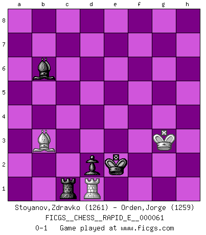 Last move : 0-1 2011 November 19 18:6:59 [Event "FICGS__CHESS__RAPID_E__000061"] [Site "FICGS"] [Date "2011.09.09"] [Round "1"] [White "Stoyanov,Zdravko"] [Black "Orden,Jorge"] [Result "0-1"] [WhiteElo "1261"] [BlackElo "1259"] 1.e4 c5 2.Nf3 d6 3.h3 Nf6 4.c3 e6 5.a3 Be7 6.d3 O-O 7.Be2 b5 8.O-O Bb7 9.a4 bxa4 10.Rxa4 Bc6 11.Ra1 a5 12.b4 cxb4 13.cxb4 a4 14.Nc3 Qb6 15.d4 Qxb4 16.Na2 Qa5 17.Bd2 Qc7 18.Nc3 Nxe4 19.Nxe4 Bxe4 20.Rxa4 Rxa4 21.Qxa4 Qc6 22.Qd1 Nd7 23.Be3 Nf6 24.Bg5 h6 25.Be3 Nh7 26.Qc1 Qxc1 27.Rxc1 g5 28.Rc7 Re8 29.Nd2 Nf6 30.f3 Bd5 31.Bc4 Kg7 32.Bb5 Bd8 33.Rc8 Rf8 34.Nc4 Bxc4 35.Rxc4 d5 36.Rc1 Nh5 37.Ra1 f5 38.Bd7 f4 39.Bf2 Kf6 40.Ra6 Ng7 41.Bc6 Kf5 42.g4+ fxg3 43.Bxg3 Nh5 44.Kg2 Nxg3 45.Kxg3 Bc7+ 46.Kf2 e5 47.dxe5 Kxe5 48.Ra1 d4 49.Rc1 Rf4 50.Bd7 Bb6 51.Bb5 d3 52.Kg2 d2 53.Rd1 Ba5 54.Kf2 Rh4 55.Bf1 Kf4 56.Ke2 h5 57.Kf2 Bb6+ 58.Ke2 Ba5 59.Kf2 g4 60.fxg4 hxg4 61.hxg4 Rxg4 62.Be2 Rh4 63.Bf3 Bb6+ 64.Kg2 Ke3 65.Kg3 Rc4 66.Bd5 Rc1 67.Bb3 Ke2 0-1 Sicilian Kingside Castling by player Black (move 6) Kingside Castling by player White (move 8) 10 pieces endgame at move 60 : White KRBPP , Black KRBPP WHITE : King + 1 Rook 1 Bishop 2 Pawns BLACK : King + 1 Rook 1 Bishop 2 Pawns 9 pieces endgame at move 60 : White KRBP , Black KRBPP WHITE : King + 1 Rook 1 Bishop 1 Pawn BLACK : King + 1 Rook 1 Bishop 2 Pawns 8 pieces endgame at move 61 : White KRBP , Black KRBP WHITE : King + 1 Rook 1 Bishop 1 Pawn BLACK : King + 1 Rook 1 Bishop 1 Pawn 7 pieces endgame at move 61 : White KRB , Black KRBP WHITE : King + 1 Rook 1 Bishop BLACK : King + 1 Rook 1 Bishop 1 Pawn Player Black won this chess game. Follow this game move after move (download)It is the aim of the modern school, not to treat every position according to one general law, but according to the principle inherent in the position. (Richard Reti) Das Spiel gibt uns die Genugtuung, die das Leben uns versagt. (Emanuel Lasker) De todos mis libros Rusos, la defensa contiene y difunde el 'calor' mas grande que pudiese verse extraño al observar lo supremamente abstracto que el Ajedrez supuestamente es. (Vladimir Nabokov) Un footballeur joue avec ses pieds, parfois avec sa tête. Un joueur d'échecs ne joue qu'avec sa tête. Et quand il ne joue plus, il meurt. (Jacob Murray) The best weapon against an enemy is another enemy. (Friedrich Nietzsche)