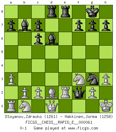 Last move : 0-1 2011 September 15 8:55:1 [Event "FICGS__CHESS__RAPID_E__000061"] [Site "FICGS"] [Date "2011.09.09"] [Round "1"] [White "Stoyanov,Zdravko"] [Black "Hakkinen,Jorma"] [Result "0-1"] [WhiteElo "1261"] [BlackElo "1258"] 1.e4 e5 2.Nf3 Nc6 3.Bb5 Nf6 4.Bxc6 bxc6 5.d3 Bc5 6.a3 O-O 7.Nxe5 Bb7 8.O-O d6 9.Nf3 Re8 10.h3 Nh5 11.Re1 Qf6 12.Ng5 Qxf2+ 13.Kh1 Ng3+ 14.Kh2 d5 15.Nf3 dxe4 16.dxe4 Rad8 17.Bd2 Nxe4 18.Re2 Bd6+ 19.Kh1 Ng3+ 0-1 Ruy Lopez : Berlin defense Kingside Castling by player Black (move 6) Kingside Castling by player White (move 8) Player Black won this chess game. Follow this game move after move (download)Fischer is the strongest player in the world. In fact, the strongest player who ever lived. (Larry Evans) Wenn Du einsam bist, wenn Du Dich in der Welt wie ein Fremder fühlst, spiele Schach. Das wird Deinen Geist erheben und Dein Ratgeber im Kampf sein. (Aristoteles) ¿Porque tengo que perder ante este idiota?. (Aron Nimzovich) On croit qu'il y a plus de mauvais joueurs que de bons joueurs, c'est faux : Il y a autant de joueurs qui gagnent que de joueurs qui perdent. (Philippe Geluck) Plans are ideas that never come to fruition. (Daniel Parmet)