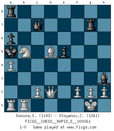 Last move : 1-0 2011 October 5 16:30:4 [Event "FICGS__CHESS__RAPID_E__000061"] [Site "FICGS"] [Date "2011.09.09"] [Round "1"] [White "Dsouza,Stanislaus"] [Black "Stoyanov,Zdravko"] [Result "1-0"] [WhiteElo "1143"] [BlackElo "1261"] 1.e4 c5 2.Nf3 a6 3.a4 Nc6 4.Bc4 h6 5.d4 cxd4 6.Nxd4 Nxd4 7.Qxd4 f6 8.Qd5 e6 9.Qh5+ Ke7 10.O-O Qc7 11.Bd3 d5 12.exd5 e5 13.b3 Bd7 14.Ba3+ Kd8 15.Bxf8 Ne7 16.Bxg7 Rg8 17.Bxf6 Bg4 18.Qxh6 Kd7 19.Bxe7 Kxe7 20.Qh7+ Kd6 21.Qh6+ Kxd5 22.Qd2 Rg7 23.Bc4+ Kc6 24.Nc3 Bh3 25.Bd5+ Kb6 26.Qe3+ Ka5 27.b4+ Kxb4 28.Rfb1+ Ka5 29.Qd2 b5 30.Nxb5 1-0 Sicilian : O'Kelly variation Kingside Castling by player White (move 10) Player White won this chess game. Follow this game move after move (download)Daring ideas are like Chess men moved forward. They may be beaten, but they may start a winning game. (Johann Wolfgang von Goethe) Schach ist Krieg, im Schach geht es um testosterongesteuerte Urschreie. (Garry Kasparov) Yo he agregado estos principios a la ley: pongan los Caballos en acción antes de que los dos Alfiles sean desarrollados. (Emanuel Lasker) Ce n'est pas pour s'amuser qu'il joue aux échecs : il célèbre un culte. (Vladimir Nabokov) I don't believe in psychology. I believe in good moves. (Bobby Fischer)