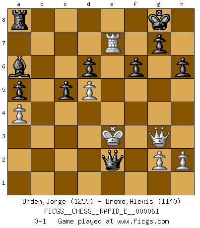 Last move : 0-1 2011 November 2 9:30:54 [Event "FICGS__CHESS__RAPID_E__000061"] [Site "FICGS"] [Date "2011.09.09"] [Round "1"] [White "Orden,Jorge"] [Black "Bromo,Alexis"] [Result "0-1"] [WhiteElo "1259"] [BlackElo "1140"] 1.e4 e5 2.Nf3 Nc6 3.Nc3 Nf6 4.Be2 Bb4 5.d3 h6 6.O-O d6 7.Bd2 O-O 8.a3 Ba5 9.b4 Bb6 10.Nd5 Nxd5 11.exd5 Nd4 12.Nxd4 Bxd4 13.c3 Bb6 14.a4 a6 15.Be3 Bxe3 16.fxe3 f6 17.Bh5 b6 18.e4 Bb7 19.d4 exd4 20.Qxd4 c5 21.bxc5 bxc5 22.Qe3 Re8 23.Bxe8 Qxe8 24.c4 a5 25.Qg3 Qxe4 26.Rfe1 Qxc4 27.Re7 Qd4+ 28.Kf1 Ba6+ 29.Ke1 Qxa1+ 30.Kf2 Qf1+ 31.Ke3 Qe2+ 0-1 Four knights game Kingside Castling by player White (move 6) Kingside Castling by player Black (move 7) Player Black won this chess game. Follow this game move after move (download)It is always better to sacrifice your opponent's men. (Savielly Tartakower) Ich bin der einzige Schachspieler, der sich während der Vorbereitungen zum Turnier verletzt hat. (Woody Allen) Una clavada es mas poderosa que una espada. (Fred Reinfeld) Comme les marins qui ont mille raisons différentes d'aller en mer, les joueurs d'échecs en ont tout autant avant de s'installer devant une table et jouer... (Vincent Bertignac, philosophe) Difficult things take a long time, impossible things a little longer. (Author unknown)