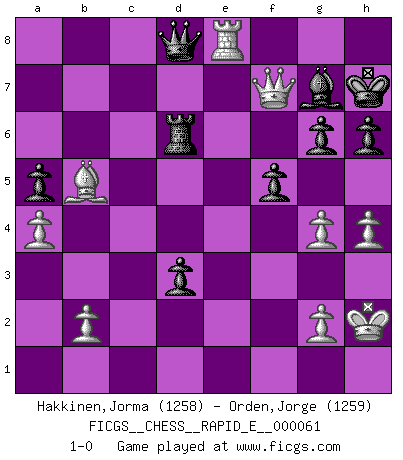 Last move : 1-0 2011 October 14 22:33:6 [Event "FICGS__CHESS__RAPID_E__000061"] [Site "FICGS"] [Date "2011.09.09"] [Round "1"] [White "Hakkinen,Jorma"] [Black "Orden,Jorge"] [Result "1-0"] [WhiteElo "1258"] [BlackElo "1259"] 1.d4 d5 2.c4 e6 3.a3 g6 4.Nf3 Bg7 5.Nc3 Ne7 6.cxd5 exd5 7.Bg5 f6 8.Bh4 O-O 9.e3 b6 10.Bd3 c5 11.dxc5 bxc5 12.O-O Nf5 13.Bg3 Nxg3 14.fxg3 Nc6 15.Qc2 Re8 16.Rae1 d4 17.exd4 Nxd4 18.Nxd4 Rxe1 19.Rxe1 cxd4 20.Nb5 f5 21.Qc4+ Kh8 22.h4 a5 23.Nc7 Ra7 24.Nb5 Rd7 25.Kh2 Ba6 26.a4 h6 27.Qe6 Kh7 28.g4 Bxb5 29.Bxb5 Rd6 30.Qf7 d3 31.Re8 1-0 Queen's gambit declined Kingside Castling by player Black (move 8) Kingside Castling by player White (move 12) Player White won this chess game. Follow this game move after move (download)The isolated Pawn casts gloom over the entire chessboard. (Aaron Nimzovich) Es gibt nur zwei wahre Schachgenies - das andere war Wilhelm Steinitz, der Weltmeister von 1872 bis 1894. (Robert James Fischer) Bobby Fischer es el jugador de Ajedrez mas grande que jamás haya existido. (Ken Smith) Horreur, mais aussi harmonie suprême : qu'y avait-il en effet au monde en dehors des échecs ? Le brouillard, l'inconnu, le non-être... (Vladimir Nabokov) When a man with money meets a man with experience, the man with experience leaves with money and the man with money leaves with experience. (Anonymous)