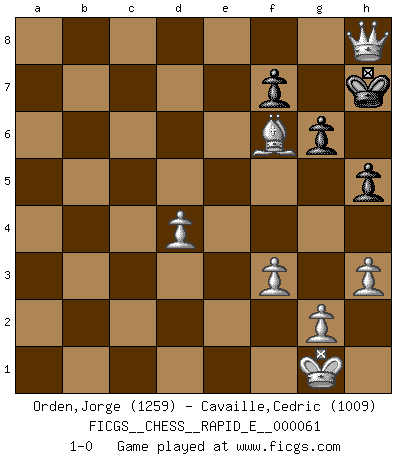 Last move : 1-0 2011 November 2 16:58:52 [Event "FICGS__CHESS__RAPID_E__000061"] [Site "FICGS"] [Date "2011.09.09"] [Round "1"] [White "Orden,Jorge"] [Black "Cavaille,Cedric"] [Result "1-0"] [WhiteElo "1259"] [BlackElo "1009"] 1.e4 c5 2.Nf3 d6 3.d4 cxd4 4.Nxd4 e5 5.Nf3 Nf6 6.Nc3 Be7 7.Be2 O-O 8.O-O a6 9.h3 b5 10.Be3 Bb7 11.a3 d5 12.exd5 Nxd5 13.Nxe5 Nd7 14.Nxd5 Nxe5 15.Nxe7+ Qxe7 16.b4 a5 17.Bxb5 axb4 18.axb4 Qxb4 19.Bd3 Nxd3 20.cxd3 Rxa1 21.Qxa1 Qb5 22.Rb1 Qc6 23.f3 Bc8 24.Rc1 Qe6 25.Bc5 Rd8 26.d4 Qd5 27.Bb6 Rd6 28.Rxc8+ Rd8 29.Rxd8+ Qxd8 30.Bxd8 g6 31.Bf6 h5 32.Qa8+ Kh7 33.Qh8+ 1-0 Sicilian Kingside Castling by player Black (move 7) Kingside Castling by player White (move 8) Player White won this chess game. Follow this game move after move (download)I am still a victim of Chess. It has all the beauty of art and much more. It cannot be commercialized. Chess is much purer than art in its social position. (Marcel Duchamp) Wenn ich mich einlogge, glauben die Leute gewöhnlich nicht, dass ich es selbst bin und sie fangen an, mir dumme Fragen zu stellen. Und wenn sie es glauben, stellen sie wieder andere dumme Fragen. (Judith Polgar) El juego de Fischer siempre fue nítido, racional y brillante. Uno de los mejores por siempre. (Dave Regis) Fischer est le meilleur joueur du monde et Karpov n'est qu'un joueur de bistrot. (Garry Kasparov, agé de 16 ans) Beep ! (R2D2 in Star Wars ep.3)