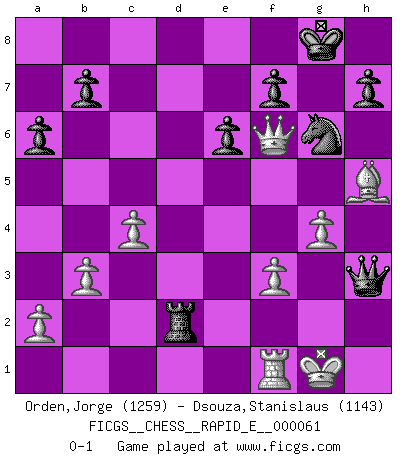 Last move : 0-1 2011 October 17 19:12:19 [Event "FICGS__CHESS__RAPID_E__000061"] [Site "FICGS"] [Date "2011.09.09"] [Round "1"] [White "Orden,Jorge"] [Black "Dsouza,Stanislaus"] [Result "0-1"] [WhiteElo "1259"] [BlackElo "1143"] 1.e4 c5 2.Nf3 d5 3.exd5 Qxd5 4.c4 Qd8 5.b3 Bg4 6.Be2 Nc6 7.h3 Bxf3 8.Bxf3 Qc7 9.O-O Nf6 10.Bb2 e6 11.Bxf6 gxf6 12.Nc3 a6 13.Ne4 Be7 14.Bh5 Ne5 15.d4 cxd4 16.Qxd4 Rd8 17.Qe3 Ng6 18.Rad1 O-O 19.Qf3 Ne5 20.Nxf6+ Bxf6 21.Qxf6 Ng6 22.Rxd8 Rxd8 23.g4 Rd3 24.f3 Qg3+ 25.Kh1 Qxh3+ 26.Kg1 Rd2 0-1 Sicilian defense Kingside Castling by player White (move 9) Kingside Castling by player Black (move 18) Player Black won this chess game. Follow this game move after move (download)Those who say they understand Chess, understand nothing. (Robert Hubner) Herr Iljumschinow ist ein etwas merkwürdiger Geschäftsmann: Er arbeitet zusammen mit Leuten wie Muammar al-Gaddafi; früher ist das Saddam Hussein gewesen. (Joel Lautier) Uno no tiene que jugar muy bien, es suficiente jugar mejor que el oponente. (Siegbert Tarrasch) Roi des jeux et jeu des rois, les échecs portent en eux un sentiment d'infini. Ils donnent à celui qui s'est efforcé d'en approfondir les arcanes l'impression de n'être pas à la mesure de l'homme; en fait, ils constituent un résumé de l'univers, un microcosme, et figurent cette grande échelle qui, dans les plans de la lumière descend jusqu'à la matière, qui des abîmes insondables remonte jusqu'en l'infini de Dieu. (Pyrame) Even the best needles are not sharp at both ends. (Chinese proverb)