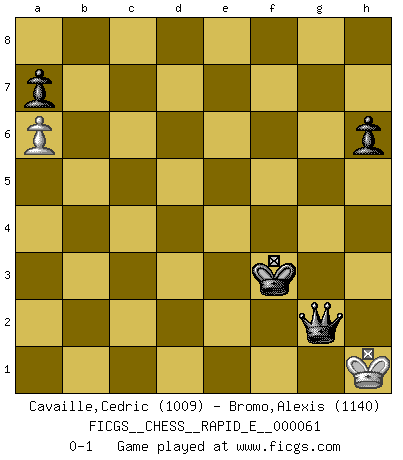Last move : 0-1 2011 October 21 21:15:48 [Event "FICGS__CHESS__RAPID_E__000061"] [Site "FICGS"] [Date "2011.09.09"] [Round "1"] [White "Cavaille,Cedric"] [Black "Bromo,Alexis"] [Result "0-1"] [WhiteElo "1009"] [BlackElo "1140"] 1.e4 e5 2.Nf3 Nc6 3.Bc4 h6 4.a3 Nf6 5.Nc3 Bc5 6.b4 Bb6 7.d3 Ng4 8.Be3 Bxe3 9.fxe3 Nxe3 10.Qe2 Nxc4 11.dxc4 d6 12.O-O Bg4 13.Qf2 Bxf3 14.Qxf3 f6 15.Nd5 Nd4 16.Qd3 c6 17.Ne3 O-O 18.c3 Ne6 19.c5 dxc5 20.Qxd8 Raxd8 21.bxc5 Nxc5 22.Rab1 b5 23.c4 Nxe4 24.Rfc1 Nd2 25.Rb2 bxc4 26.Nxc4 Nxc4 27.Rxc4 Rc8 28.Rbc2 f5 29.Rxc6 Rxc6 30.Rxc6 Ra8 31.Rc5 Re8 32.a4 Kf7 33.Rc7+ Re7 34.Rxe7+ Kxe7 35.h3 Kf6 36.g4 fxg4 37.hxg4 Kg5 38.Kf2 Kxg4 39.a5 Kf4 40.Ke2 Ke4 41.Kd2 Kd4 42.Ke2 e4 43.Kd2 e3+ 44.Ke2 g5 45.a6 g4 46.Kf1 Kd3 47.Ke1 g3 48.Kf1 e2+ 49.Ke1 g2 50.Kf2 e1Q+ 51.Kxg2 Ke3 52.Kh3 Kf3 53.Kh2 Qg3+ 54.Kh1 Qg2+ 0-1 King's pawn game Kingside Castling by player White (move 12) Kingside Castling by player Black (move 17) 10 pieces endgame at move 34 : White KPPP , Black KPPPPP WHITE : King + 3 Pawns BLACK : King + 5 Pawns 9 pieces endgame at move 36 : White KPP , Black KPPPPP WHITE : King + 2 Pawns BLACK : King + 5 Pawns 8 pieces endgame at move 37 : White KPP , Black KPPPP WHITE : King + 2 Pawns BLACK : King + 4 Pawns 7 pieces endgame at move 38 : White KP , Black KPPPP WHITE : King + 1 Pawn BLACK : King + 4 Pawns Promotion Queen by player Black (move 50) 6 pieces endgame at move 51 : White KP , Black KQPP WHITE : King + 1 Pawn BLACK : King + 1 Queen 2 Pawns Player Black won this chess game. Follow this game move after move (download)Weak points or holes in the opponent's position must be occupied by pieces not Pawns. (Siegbert Tarrasch) Ein Schachspiel besteht aus drei Phasen: Die erste, wenn du hofftst den Vorteil zu haben, die zweite, wenn du glaubst einen Vorteil zu haben, und die dritte.... wenn du weißt Du wirst verlieren. (Savielly Grigorievitsch Tartakower) La caracteristica mas importante en la posición del Ajedrez es la actividad de las piezas. Esto es absolutamente fundamental en todas las fases del juego: Apertura, Juego Medio y especialmente Finales. La limitación primordial en la actividad de una pieza, es la estructuración de los Peones. (Michael Stean) Le thème de l'attaque double intervient d'une manière ou d'une autre dans l'immense majorité des combinaisons. (Youri Averbakh) Humor is by far the most significant activity of the human brain. (Edward De Bono)