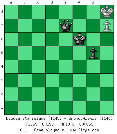Last move : 0-1 2011 November 12 13:22:22 [Event "FICGS__CHESS__RAPID_E__000061"] [Site "FICGS"] [Date "2011.09.09"] [Round "1"] [White "Dsouza,Stanislaus"] [Black "Bromo,Alexis"] [Result "0-1"] [WhiteElo "1143"] [BlackElo "1140"] 1.e4 e5 2.Nf3 Nc6 3.Bc4 h6 4.d4 exd4 5.Nxd4 Nxd4 6.Qxd4 d6 7.O-O c5 8.Qd3 Nf6 9.Nc3 a6 10.Nd5 Nxd5 11.exd5 Be7 12.Be3 b5 13.Bxb5+ axb5 14.Qxb5+ Bd7 15.Qe2 Rb8 16.b3 Bb5 17.c4 Bd7 18.Rfe1 O-O 19.Bxh6 gxh6 20.Qxe7 Qxe7 21.Rxe7 Bf5 22.f3 Rfe8 23.Rae1 Rxe7 24.Rxe7 Bb1 25.Re2 Bxa2 26.Rxa2 Rxb3 27.Rc2 Kg7 28.Kf2 Kf6 29.Kg3 Ke5 30.Kg4 Kd4 31.Kf5 Rc3 32.Rxc3 Kxc3 33.Kf6 Kxc4 34.Kxf7 Kxd5 35.f4 c4 36.f5 c3 37.f6 c2 38.Ke7 c1Q 39.f7 Qg5+ 40.Ke8 Qe5+ 41.Kf8 Ke6 42.Kg8 Qf6 43.f8Q Qxf8+ 44.Kxf8 d5 45.g4 d4 46.h4 d3 47.g5 hxg5 48.h5 d2 49.h6 d1Q 50.h7 Qd8+ 51.Kg7 Qe7+ 52.Kh8 Kf6 0-1 King's pawn game Kingside Castling by player White (move 7) Kingside Castling by player Black (move 18) 10 pieces endgame at move 33 : White KPPPP , Black KPPPP WHITE : King + 4 Pawns BLACK : King + 4 Pawns 9 pieces endgame at move 34 : White KPPPP , Black KPPP WHITE : King + 4 Pawns BLACK : King + 3 Pawns 8 pieces endgame at move 34 : White KPPP , Black KPPP WHITE : King + 3 Pawns BLACK : King + 3 Pawns Promotion Queen by player Black (move 38) Promotion Queen by player White (move 43) 7 pieces endgame at move 43 : White KPP , Black KQPP WHITE : King + 2 Pawns BLACK : King + 1 Queen 2 Pawns 6 pieces endgame at move 44 : White KPP , Black KPP WHITE : King + 2 Pawns BLACK : King + 2 Pawns 5 pieces endgame at move 47 : White KP , Black KPP WHITE : King + 1 Pawn BLACK : King + 2 Pawns Promotion Queen by player Black (move 49) Player Black won this chess game. Follow this game move after move (download)Chess is a terrific way for kids to build self image and self esteem. (Saudin Robovic) Spielt Blackmar-Diemer-Gambit, und das Matt kommt von selbst! (Emil Joseph Diemer) Nunca antes ha habido un jugador de Ajedrez con tal conocimiento a fondo de las complejidades del juego y una inmensa voluntad absolutamente indomable de ganar. Yo pienso que Fischer es el jugador mas grande que jamás haya existido. (Lisa Lane) Des points faibles ou des trous dans la position de l'adversaire doivent être occupés par des pièces et non pas par des pions. (Siegbert Tarrasch) All politicians must be presumed guilty until they are proven innocent. (Dinesh De Silva)