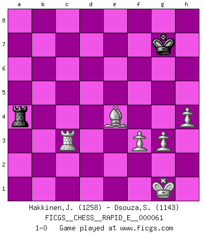 Last move : 1-0 2011 October 20 13:25:8 [Event "FICGS__CHESS__RAPID_E__000061"] [Site "FICGS"] [Date "2011.09.09"] [Round "1"] [White "Hakkinen,Jorma"] [Black "Dsouza,Stanislaus"] [Result "1-0"] [WhiteElo "1258"] [BlackElo "1143"] 1.d4 c6 2.c4 Nf6 3.Nf3 d5 4.Bg5 e6 5.a3 h6 6.Bxf6 Qxf6 7.e3 dxc4 8.Nc3 b5 9.Be2 Bd6 10.O-O O-O 11.e4 e5 12.dxe5 Bxe5 13.Nxe5 Qxe5 14.Bf3 Be6 15.Re1 Nd7 16.Qd2 Nc5 17.Rad1 Nb3 18.Qd6 Qxd6 19.Rxd6 Rfc8 20.e5 Na5 21.Ne4 Rab8 22.Nc5 g6 23.Nxe6 fxe6 24.Rxe6 c5 25.Rxg6+ Kh7 26.Be4 Kh8 27.Rxh6+ Kg7 28.Rh7+ Kg8 29.e6 Re8 30.Rxa7 Kf8 31.Bg6 Re7 32.Rxa5 Rb6 33.g3 R7xe6 34.Rxe6 Rxe6 35.Ra8+ Kg7 36.Be8 Re2 37.Bxb5 Rxb2 38.Bxc4 Rc2 39.Bd3 Rd2 40.Be4 Re2 41.f3 c4 42.a4 c3 43.Rc8 Ra2 44.Rxc3 Rxa4 45.h4 1-0 Queen's pawn Kingside Castling by player White (move 10) Kingside Castling by player Black (move 10) 10 pieces endgame at move 38 : White KRBPPPP , Black KRP WHITE : King + 1 Rook 1 Bishop 4 Pawns BLACK : King + 1 Rook 1 Pawn 9 pieces endgame at move 44 : White KRBPPPP , Black KR WHITE : King + 1 Rook 1 Bishop 4 Pawns BLACK : King + 1 Rook 8 pieces endgame at move 44 : White KRBPPP , Black KR WHITE : King + 1 Rook 1 Bishop 3 Pawns BLACK : King + 1 Rook Player White won this chess game. Follow this game move after move (download)Chess is a forcing house where the fruits of character can ripen more fully than in life. (Edward Morgan Foster) Wenn Du absolut nicht mehr weißt, was Du tun sollst, dann ist es Zeit für Panik. (John van der Wiel) El Ajedrez no es como la vida... ¡tiene reglas!. (Mark Pasternak) Le pion, dans sa simplicité, marche droit devant lui, mais lorsqu'il prend, il le fait obliquement? Ainsi l'homme, tant qu'il reste pauvre, marche dans la droiture et vit honnêtement, mais lorsqu'il recherche les honneurs, il flatte, se parjure et, par les voies obliques, cherche une position supérieure sur l'échiquier du monde. (Jean de Galles) Art is the only way to run away without leaving home. (Twyla Tharp)