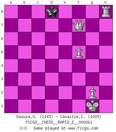 Last move : 1-0 2011 November 6 20:15:3 [Event "FICGS__CHESS__RAPID_E__000061"] [Site "FICGS"] [Date "2011.09.09"] [Round "1"] [White "Dsouza,Stanislaus"] [Black "Cavaille,Cedric"] [Result "1-0"] [WhiteElo "1143"] [BlackElo "1009"] 1.e4 c5 2.Nf3 d6 3.Bc4 e6 4.d4 cxd4 5.Nxd4 d5 6.exd5 exd5 7.Bd3 Nf6 8.O-O Be7 9.Bf4 O-O 10.c4 dxc4 11.Bxc4 Be6 12.Bxe6 fxe6 13.Nxe6 Qxd1 14.Rxd1 h6 15.Nc7 Nh5 16.Bg3 Nxg3 17.hxg3 Nc6 18.Nxa8 Rxa8 19.Nc3 Bf6 20.Rd2 a6 21.Rad1 b5 22.a3 Bg5 23.Rd7 a5 24.Nxb5 Bf6 25.R7d6 Rd8 26.Rxd8+ Nxd8 27.Rd7 Bxb2 28.Rxd8+ Kh7 29.a4 g5 30.Nd6 Bf6 31.Rd7+ Bg7 32.Nf5 Kg6 33.Nxg7 h5 34.Ne6 Kf5 35.Nxg5 Kxg5 36.Rd5+ Kg4 37.Rxa5 h4 38.gxh4 Kxh4 39.f4 Kg4 40.f5 Kg5 41.Rc5 Kf6 42.a5 Ke7 43.a6 Kd6 44.Ra5 Kc6 45.a7 Kb6 46.Ra1 Kb7 47.a8Q+ Kb6 48.Qd5 Kc7 49.Ra6 Kb8 50.Rh6 Kc7 51.Qf7+ Kd8 52.Rh8+ 1-0 Sicilian Kingside Castling by player White (move 8) Kingside Castling by player Black (move 9) 10 pieces endgame at move 35 : White KRNPPPP , Black KPP WHITE : King + 1 Rook 1 Knight 4 Pawns BLACK : King + 2 Pawns 9 pieces endgame at move 35 : White KRPPPP , Black KPP WHITE : King + 1 Rook 4 Pawns BLACK : King + 2 Pawns 8 pieces endgame at move 37 : White KRPPPP , Black KP WHITE : King + 1 Rook 4 Pawns BLACK : King + 1 Pawn 7 pieces endgame at move 38 : White KRPPPP , Black K WHITE : King + 1 Rook 4 Pawns BLACK : King + 6 pieces endgame at move 38 : White KRPPP , Black K WHITE : King + 1 Rook 3 Pawns BLACK : King + Promotion Queen by player White (move 47) Player White won this chess game. Follow this game move after move (download)Personally, I rather look forward to a computer program winning the world Chess Championship. Humanity needs a lesson in humility. (Richard Dawkings) Ich würde mich als ganz normalen Jungen bezeichnen [Im Alter von 12]. (Sergej Karjakin) El Ajedrez es una manera fabulosa para que los niños aprendan a autovalorarse y a autoestimarse. (Saudin Robovic) Même un GMI sait rarement calculer sur plus de cinq coups une attaque à sacrifices. (Rudolf Spielmann) I feel so... helpless. (C-3PO in Star Wars ep.3)