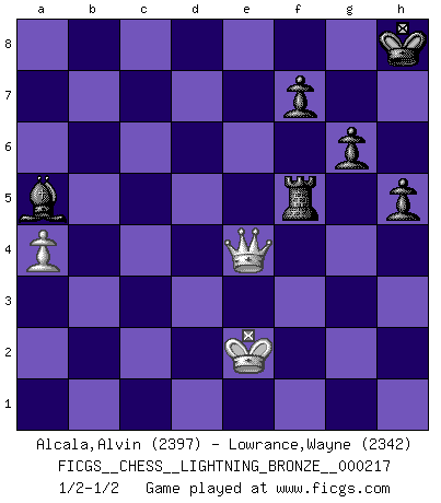 Last move : 1/2-1/2 2011 September 10 20:47:43 [Event "FICGS__CHESS__LIGHTNING_BRONZE__000217"] [Site "FICGS"] [Date "2011.09.10"] [Round "1"] [White "Alcala,Alvin"] [Black "Lowrance,Wayne"] [Result "1/2-1/2"] [WhiteElo "2397"] [BlackElo "2342"] 1.e4 c5 2.Nf3 Nc6 3.Bb5 g6 4.O-O Bg7 5.Bxc6 bxc6 6.Re1 Nf6 7.e5 Nd5 8.c4 Nc7 9.d3 O-O 10.Nc3 Ne6 11.Be3 d6 12.Ne4 Rb8 13.Rb1 h6 14.Qa4 Qc7 15.Qa3 Rb6 16.Qa5 Rd8 17.b3 dxe5 18.Nxc5 Nxc5 19.Bxc5 Rxd3 20.Bxb6 axb6 21.Qa3 Bg4 22.Re3 Rd8 23.Rbe1 Bxf3 24.gxf3 e6 25.c5 Qe7 26.b4 bxc5 27.bxc5 Qg5+ 28.Kf1 Qf5 29.Qa6 h5 30.Kg2 Qg5+ 31.Kf1 Qf4 32.Rd3 Rb8 33.Qxc6 Rb2 34.Red1 Qxh2 35.R1d2 Rb4 36.Ke2 e4 37.Rb3 exf3+ 38.Qxf3 Qe5+ 39.Kf1 Rf4 40.Qd3 Bf6 41.Qc2 Kg7 42.c6 Rh4 43.Kg2 Qh2+ 44.Kf1 Bg5 45.c7 Bxd2 46.c8Q Qh1+ 47.Ke2 Qe1+ 48.Kd3 Ba5 49.Qc8c6 e5 50.Qd5 Rf4 51.Rb8 Bc7 52.Rb1 e4+ 53.Kd4 e3 54.Kd3 exf2 55.Qc3+ Qxc3+ 56.Kxc3 f1Q 57.Rxf1 Rxf1 58.Qd4+ Kh7 59.a4 Bg3 60.Qd3 Be1+ 61.Kc2 Rf5 62.Kd1 Ba5 63.Qe4 Kg8 64.Ke2 Kh8 1/2-1/2 Sicilian : Nimzovich-Rossolimo attack (with ...g6, without ...d6) Kingside Castling by player White (move 4) Kingside Castling by player Black (move 9) Promotion Queen by player White (move 46) Promotion Queen by player Black (move 56) 10 pieces endgame at move 57 : White KQRP , Black KRBPPP WHITE : King + 1 Queen 1 Rook 1 Pawn BLACK : King + 1 Rook 1 Bishop 3 Pawns 9 pieces endgame at move 57 : White KQP , Black KRBPPP WHITE : King + 1 Queen 1 Pawn BLACK : King + 1 Rook 1 Bishop 3 Pawns This chess game ended in a draw. Follow this game move after move (download)Chess is a more highly symbolic game, but the aggressions are therefore even more frankly represented in the play. It probably began as a war game; that is, the representation of a miniature battle between the forces of two kingdoms. (Karl Meninger) Ja, jede Frau in Holland liebt mich bestimmt, und alle Männer hassen mich. (Loek van Wely) Solo existe una cosa que Fischer hace en el Ajedrez sin placer: ¡perder!. (Boris Spassky) Les échecs sont plus proches de l'art de l'assassinat que de l'art de la guerre. (Arturo Perez-Reverte) If you lose the game you should win the analysis! (Proverb)