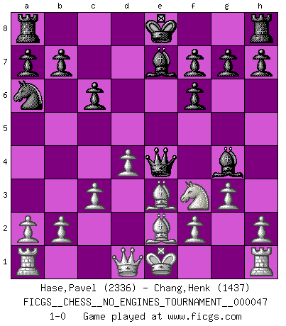 Last move : 1-0 2011 December 7 3:31:2 [Event "FICGS__CHESS__NO_ENGINES_TOURNAMENT__000047"] [Site "FICGS"] [Date "2011.09.10"] [Round "1"] [White "Hase,Pavel"] [Black "Chang,Henk"] [Result "1-0"] [WhiteElo "2336"] [BlackElo "1437"] 1.e4 d5 2.exd5 Qxd5 3.Nc3 Qa5 4.d4 c6 5.Bd2 Nf6 6.Ne4 Qf5 7.Nxf6+ exf6 8.Nf3 Be7 9.g3 Qe4+ 10.Be2 Bg4 11.Be3 Na6 12.c3 1-0 This chess game has been lost on time (started : 2011.09.10 22:59:33) Scandinavian (centre counter) defense Player White won this chess game. Follow this game move after move (download)All my games are real. (Bobby Fischer) Ein Springer auf f6 gegen die eigene Rochadestellung ist schlimmer als ein rostiger Nagel im Knie. (Efim Bogoljubov) El juego de Fischer siempre fue nítido, racional y brillante. Uno de los mejores por siempre. (Dave Regis) A chaque perte on perd un peu de soi. (Joël Lautier) If you have any trouble condescending, find a Unix user to show you how it's done. (Scott Adams)