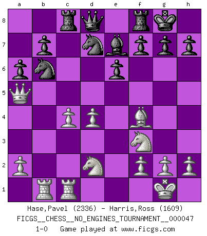 Last move : 1-0 2011 September 28 9:0:49 [Event "FICGS__CHESS__NO_ENGINES_TOURNAMENT__000047"] [Site "FICGS"] [Date "2011.09.10"] [Round "1"] [White "Hase,Pavel"] [Black "Harris,Ross"] [Result "1-0"] [WhiteElo "2336"] [BlackElo "1609"] 1.e4 c6 2.d4 d5 3.exd5 cxd5 4.c3 Nc6 5.Nf3 Bg4 6.Bf4 Nf6 7.Qb3 Na5 8.Bb5+ Bd7 9.Qa4 Nc4 10.b3 Nb6 11.Qa5 a6 12.Bxd7+ Nfxd7 13.O-O e6 14.Nbd2 Be7 15.c4 dxc4 16.bxc4 O-O 17.Rab1 Rc8 18.Rfc1 1-0 Caro-Kann : Exchange variation Kingside Castling by player White (move 13) Kingside Castling by player Black (move 16) Player White won this chess game. Follow this game move after move (download)Dazzling combinations are for the many, shifting wood is for the few. (Georg Kieninger) Schach ist das schnellste Spiel der Welt, weil man in jeder Sekunde Tausende von Gedanken ordnen muß. (Albert Einstein) El Ajedrez es tortura mental. (Garry Kasparov) C'est une question de caractère, Beaucoup de gens perdent leur motivation très vite. D'autres, ils sont rares, peuvent la conserver très longtemps. J'aime les échecs, encore aujourd'hui je suis heureux d'analyser des parties. J'aime toujours gagner, je déteste encore perdre. Bien jouer est important pour mon intégrité intellectuelle et morale. Et puis les échecs vivent en ce moment une période historique grâce à Internet. Ils se développent dans les systèmes éducatifs à travers le monde. Ils sortent de leur ghetto, et c'est mon rôle de mener à bien cette révolution. (Gary Kasparov) There's no money in correspondence chess. (John Knudsen)
