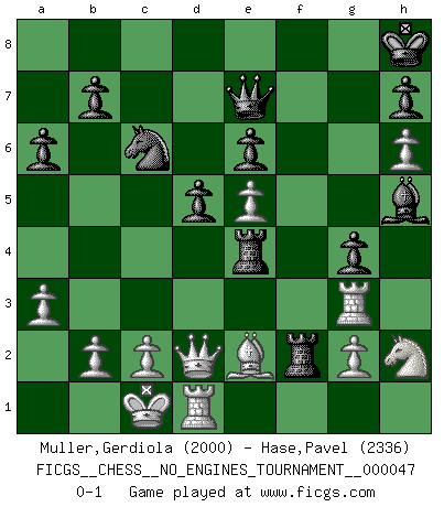 Last move : 0-1 2011 October 23 12:0:43 [Event "FICGS__CHESS__NO_ENGINES_TOURNAMENT__000047"] [Site "FICGS"] [Date "2011.09.10"] [Round "1"] [White "Muller,Gerdiola"] [Black "Hase,Pavel"] [Result "0-1"] [WhiteElo "2000"] [BlackElo "2336"] 1.e4 e6 2.d4 d5 3.Nc3 Bb4 4.e5 c5 5.Bd2 Nc6 6.a3 Bxc3 7.Bxc3 cxd4 8.Bxd4 Nge7 9.f4 Nxd4 10.Qxd4 Nc6 11.Qd3 f6 12.Nf3 O-O 13.Be2 fxe5 14.fxe5 Bd7 15.O-O-O a6 16.h4 Qe7 17.Ng5 g6 18.Qe3 Rf5 19.Nf3 Raf8 20.h5 g5 21.Bd3 Rf4 22.h6 Be8 23.Rh3 g4 24.Rg3 Kh8 25.Nh2 Bh5 26.Be2 Re4 27.Qd2 Rf2 0-1 French : Winawer, Advance, Bogolyubov variation Kingside Castling by player Black (move 12) Queenside Castling by player White (move 15) Player Black won this chess game. Follow this game move after move (download)Openings teach you openings. Endgames teach you chess ! (Stephan Gerzadowicz) Ein Teil des Fehlers ist immer korrekt. (Savielly Grigorievitsch Tartakower) El Ajedrez es un expediente tonto que hace creer a la gente inactiva que hacen una cosa muy astuta cuando solamente estan perdiendo su tiempo. (George Bernard Shaw) Si je n'étais pas joueur d'échecs, je serais le meilleur dans quelque chose d'autre. (Anatoli Karpov) The Internet isn't free. It just has an economy that makes no sense to capitalism. (Brad Shapcott)