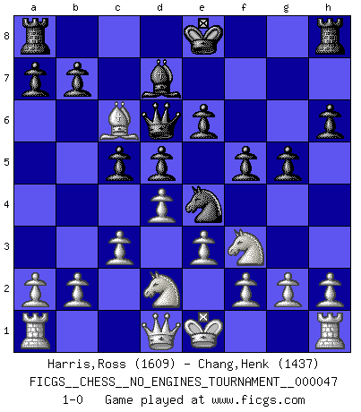 Last move : 1-0 2011 December 2 15:0:43 [Event "FICGS__CHESS__NO_ENGINES_TOURNAMENT__000047"] [Site "FICGS"] [Date "2011.09.10"] [Round "1"] [White "Harris,Ross"] [Black "Chang,Henk"] [Result "1-0"] [WhiteElo "1609"] [BlackElo "1437"] 1.d4 Nf6 2.Nf3 d5 3.Bf4 c5 4.e3 e6 5.c3 Nc6 6.Bd3 Bd6 7.Bg5 h6 8.Bh4 g5 9.Bg3 Ne4 10.Bxd6 Qxd6 11.Nbd2 f5 12.Bb5 Bd7 13.Bxc6 1-0 This chess game has been lost on time (started : 2011.09.10 22:59:33) Queen's pawn game Player White won this chess game. Follow this game move after move (download)Chess is no whit inferior to the violin, and we have a large number of professional violinists. (Mikhail Botvinnik) Im Schach nämlich geht es darum, daß Ich des Gegners klein zu kriegen, sein Ego zu zerbrechen und zu zermahlen, seine Selbstachtung zu zertreten und zu verscharren und seine ganze mißachtenswerte sogenannte Persönlichkeit ein für alle Mal tot zu hacken und zu zerstampfen und dadurch die menschliche Gesellschaft von einer stinkenden Pestbeule zu befreien. Es ist ein königliches Spiel. (Robert James Fischer) Siempre es mucho mejor sacrificar las piezas de tu oponente. (Savielly Tartakover) La conception d'un plan est le processus par lequel un joueur exploite les avantages de sa position tout en s'efforçant d'en réduire au minimum les inconvénients. Afin de garantir le succès, un plan doit toujours se fonder sur un diagnostic objectif des particularités d'une position. La conception d'un plan est d'autant plus difficile que la position est équilibrée, et grandement facilitée lorsqu'il n'existe qu'un seul plan susceptible de répondre aux exigences de la position. (Harry Golombek) The absolute truth is the thing that makes people laugh. (Carl Reiner)