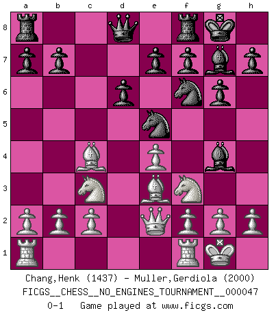 Last move : 0-1 2011 December 10 3:58:17 [Event "FICGS__CHESS__NO_ENGINES_TOURNAMENT__000047"] [Site "FICGS"] [Date "2011.09.10"] [Round "1"] [White "Chang,Henk"] [Black "Muller,Gerdiola"] [Result "0-1"] [WhiteElo "1437"] [BlackElo "2000"] 1.e4 c5 2.Nf3 g6 3.d4 cxd4 4.Qxd4 Nf6 5.Bc4 Nc6 6.Qe3 Bg7 7.Nc3 O-O 8.O-O d6 9.Qe2 Bg4 10.Be3 Ne5 0-1 This chess game has been lost on time (started : 2011.09.10 22:59:33) Sicilian : Hungarian variation Kingside Castling by player Black (move 7) Kingside Castling by player White (move 8) Player Black won this chess game. Follow this game move after move (download)At this time Fischer is simply a level above all the best Chessplayers in the world. (John Jacobs) Das typische an einem Großmeister ist, daß er eine gewonnene Position schnell und schmerzlos gewinnt. (Irving Chernev) Aquellos que dicen que entienden al Ajedrez, no entienden nada. (Robert Hubner) Il s'avisa de me proposer d'apprendre les échecs qu'il jouait un peu... me voilà forcené des échecs. J'achète un échiquier, je m'enferme dans ma chambre, j'y passe des jours et des nuits à vouloir apprendre par cur toutes les parties. (Jean-Jacques Rousseau, Confessions) Programming can only do so much before it becomes too much. (Don Groves)