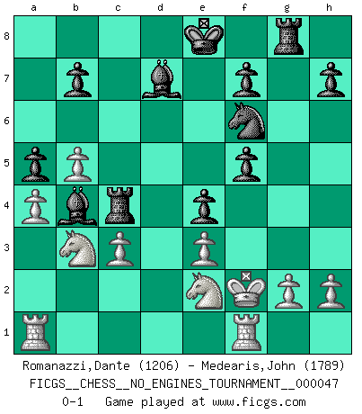 Last move : 0-1 2012 January 18 6:19:42 [Event "FICGS__CHESS__NO_ENGINES_TOURNAMENT__000047"] [Site "FICGS"] [Date "2011.09.10"] [Round "1"] [White "Romanazzi,Dante"] [Black "Medearis,John"] [Result "0-1"] [WhiteElo "1206"] [BlackElo "1789"] 1.d4 d5 2.Bf4 Nf6 3.e3 c6 4.f3 e6 5.a3 Bd6 6.Bg5 Qa5+ 7.Qd2 Bc7 8.Qxa5 Bxa5+ 9.b4 Bb6 10.Bxf6 gxf6 11.Bd3 Nd7 12.Ne2 f5 13.O-O Nf6 14.Nbc3 Bd7 15.a4 a5 16.b5 c5 17.dxc5 Bxc5 18.Kf2 Rg8 19.Nd4 e5 20.Nb3 Bb4 21.Ne2 e4 22.fxe4 dxe4 23.Bc4 Rc8 24.c3 Rxc4 0-1 This chess game has been lost on time (started : 2011.09.10 22:59:33) Queen's pawn, Mason variation Kingside Castling by player White (move 13) Player Black won this chess game. Follow this game move after move (download)In a gambit you give up a Pawn for the sake of getting a lost game. (Samuel Standige Boden) Kritik überlasse ich den Spießern. Ich zeige nichts, wofür ich mich schämen muss. (Alexandra Kosteniuk) Si un gobernante no entiende al Ajedrez, ¿como puede governar él un reinado?. (El Rey Khusros II) Aux échecs, les retours au sommet sont rares : les dommages psychologiques consécutifs à une défaite sont trop sévères. (Daily Telegraph) If computers get too powerful, we can organize them into committees. That'll do them in. (Anonymous)