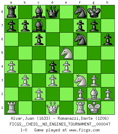 Last move : 1-0 2012 January 14 6:0:25 [Event "FICGS__CHESS__NO_ENGINES_TOURNAMENT__000047"] [Site "FICGS"] [Date "2011.09.10"] [Round "1"] [White "Alvar,Juan"] [Black "Romanazzi,Dante"] [Result "1-0"] [WhiteElo "1633"] [BlackElo "1206"] 1.Nf3 d5 2.g3 Nf6 3.Bg2 c6 4.O-O Nbd7 5.b3 e5 6.Bb2 Bd6 7.d3 O-O 8.Nbd2 h6 9.e4 d4 10.a4 Nh7 11.Nc4 Bc7 12.Ba3 Ndf6 13.Bxf8 Nxf8 14.Ncxe5 1-0 This chess game has been lost on time (started : 2011.09.10 22:59:33) Reti : King's Indian attack (Barcza system) Kingside Castling by player White (move 4) Kingside Castling by player Black (move 7) Player White won this chess game. Follow this game move after move (download)Play the opening like a book, the middle game like a magician, and the endgame like a machine. (Spielmann) Jede Eröffnung ist gut genug um gespielt zu werden, wenn nur ihr Ruf schlecht genug ist. (Savielly Grigorievitsch Tartakower) El Ajedrez es parte de la cultura, y si una cultura esta en decadencia, entonces también el Ajedrez declinará. (Mikhail Botvinnik) Un journaliste : 'Vous préférez avoir une dame de plus sur l'échiquier ou au lit ?' Boris Spassky : 'Ca dépend de la position.' My poor ole parrot... Is not in the circulation of displays ....poo hoo hoo :) (Wayne Lowrance's enigma)