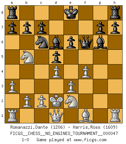 Last move : 1-0 2012 January 1 17:34:56 [Event "FICGS__CHESS__NO_ENGINES_TOURNAMENT__000047"] [Site "FICGS"] [Date "2011.09.10"] [Round "1"] [White "Romanazzi,Dante"] [Black "Harris,Ross"] [Result "1-0"] [WhiteElo "1206"] [BlackElo "1609"] 1.d4 d5 2.Bf4 Nf6 3.e3 Bf5 4.f3 e6 5.a3 Be7 6.h4 Nh5 7.Ne2 Nxf4 8.Nxf4 Bxh4+ 9.Kd2 Bg3 10.Ne2 Bd6 11.g4 Bg6 12.Nbc3 Nc6 13.f4 Qe7 14.g5 f6 15.gxf6 Qxf6 16.Nb5 1-0 This chess game has been lost on time (started : 2011.09.10 22:59:33) Queen's pawn, Mason variation Player White won this chess game. Follow this game move after move (download)The Chess pieces are the block alphabet which shapes thoughts; and these thoughts, although making a visual design on the chessboard, express their beauty abstractly, like a poem. (Marcel Duchamp) Ich moechte nie einem Club beitreten, der Leute wie mich als Mitglieder aufnimmt. (Woody Allen) No nos podemos resistir a la fascinación de un sacrificio ya que la pasión por los sacrificios es parte de la naturaleza de un jugador de Ajedrez. (Rudolf Spielman) La tactique, c'est ce que vous faites quand il y a quelque chose à faire; la stratégie, c'est ce que vous faites quand il n'y a rien à faire. (Savielli Tartacower) The smarter you play, the luckier you'll be. (Mark Pilarski)