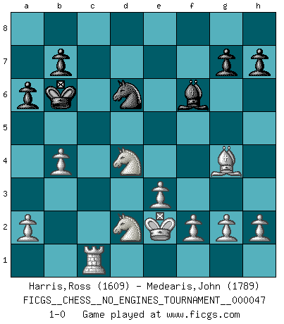 Last move : 1-0 2011 October 10 21:52:34 [Event "FICGS__CHESS__NO_ENGINES_TOURNAMENT__000047"] [Site "FICGS"] [Date "2011.09.10"] [Round "1"] [White "Harris,Ross"] [Black "Medearis,John"] [Result "1-0"] [WhiteElo "1609"] [BlackElo "1789"] 1.d4 d5 2.Nf3 Nc6 3.Bf4 f6 4.e3 Bg4 5.Be2 Qd7 6.Nbd2 O-O-O 7.c4 e5 8.dxe5 Qe6 9.Qa4 Nh6 10.cxd5 Qxd5 11.Bc4 Qa5 12.Qxa5 Nxa5 13.Be2 Be7 14.Nd4 a6 15.Rc1 Nf7 16.Bxg4+ Kb8 17.exf6 Bxf6 18.Bxc7+ Ka8 19.Bxd8 Rxd8 20.Rc8+ Ka7 21.Rxd8 Nxd8 22.Ke2 Nf7 23.b4 Nc6 24.Nxc6+ Kb6 25.Nd4 Nd6 26.Rc1 1-0 Queen's pawn game, Chigorin variation Queenside Castling by player Black (move 6) Player White won this chess game. Follow this game move after move (download)In Chess, just as in life, today's bliss may be tomorrow's poison. (Assaic) Ich las kürzlich ein Buch von Nietzsche. Er sagte Religion verdumme nur die Menschen. Ich stimme zu. (Robert James Fischer) Nos gusta pensar. (Gary Kasparov) Les Cavaliers se révèlent fort utiles dans les positions fermées. D'habitude, les Fous sont un peu plus forts que les Cavaliers dans les positions ouvertes. Qu'on le veuille ou non, il restera toujours des exceptions ! There is a great deal of difference between an eager man who wants to read a book and a tired man who wants a book to read. (G.K. Chesterton)