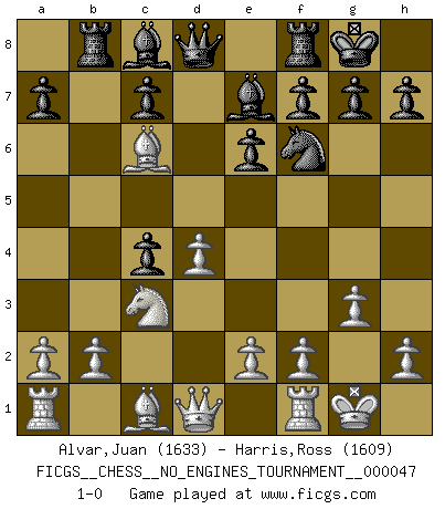 Last move : 1-0 2011 October 30 8:8:43 [Event "FICGS__CHESS__NO_ENGINES_TOURNAMENT__000047"] [Site "FICGS"] [Date "2011.09.10"] [Round "1"] [White "Alvar,Juan"] [Black "Harris,Ross"] [Result "1-0"] [WhiteElo "1633"] [BlackElo "1609"] 1.c4 Nf6 2.d4 e6 3.g3 d5 4.Bg2 Be7 5.Nc3 O-O 6.Nf3 dxc4 7.Ne5 Nc6 8.Nxc6 bxc6 9.O-O Rb8 10.Bxc6 1-0 English, 1...Nf6 (Anglo-Indian defense) Kingside Castling by player Black (move 5) Kingside Castling by player White (move 9) Player White won this chess game. Follow this game move after move (download)Tactics flow from a superior position. (Bobby Fischer) Irgendwie scheint mir sonntags früh um 9 Uhr der Killerinstinkt verloren gegangen zu sein. (Alexej Shirov) Un Peón pasado aumenta su poder a medida de que el número de piezas en el tablero disminuye. (Capablanca) Même si l'adversaire joue le coup analysé précédemment, recommencez l'analyse en voyant la nouvelle position. Première règle de Blumenfeld There are three kinds of lies: lies, damned lies and statistics. (Mark Twain)