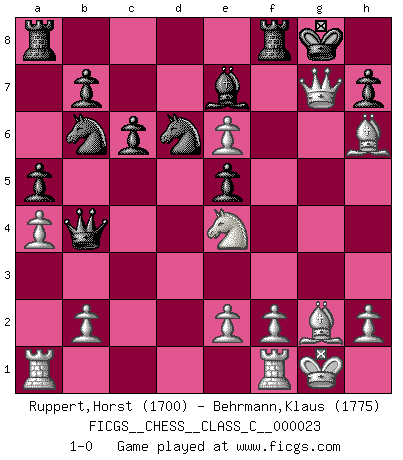 Last move : 1-0 2007 January 22 9:42:15 [Event "FICGS__CHESS__CLASS_C__000023"] [Site "FICGS"] [Date "2007.01.03"] [Round "1"] [White "Ruppert,Horst"] [Black "Behrmann,Klaus"] [Result "1-0"] [WhiteElo "1700"] [BlackElo "1775"] 1.d4 f5 2.g3 Nf6 3.Bg2 e6 4.c4 Be7 5.Nf3 O-O 6.O-O d6 7.Nc3 Nc6 8.d5 Ne5 9.Nd4 Nxc4 10.Qc2 f4 11.gxf4 e5 12.Ne6 Bxe6 13.dxe6 c6 14.Qd3 Nb6 15.a4 a5 16.fxe5 dxe5 17.Qg3 Qd6 18.Bh6 Ne8 19.Qg4 Qb4 20.Ne4 Nd6 21.Qxg7+ 1-0 Dutch defense Kingside Castling by player Black (move 5) Kingside Castling by player White (move 6) Player White won this chess game. Follow this game move after move (download)Nonsense was the last thing Fischer was interested in, as far as Chess was concerned. (Elie Agur) Fischer machte Schach einfach zu einer aufregenden Sache, wann immer er sich ans Brett setzte. (Raymond Keene) Entre mas años cumplo, mas valoro los Peones. (Keres) Un journaliste : 'Vous préférez avoir une dame de plus sur l'échiquier ou au lit ?' Boris Spassky : 'Ca dépend de la position.' Yoga is 99% practice and 1% knowledge. (Sri Krishna Pattabhi Jois)