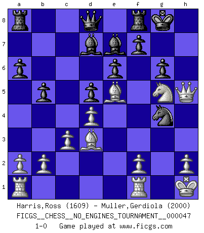 Last move : 1-0 2011 September 29 17:3:41 [Event "FICGS__CHESS__NO_ENGINES_TOURNAMENT__000047"] [Site "FICGS"] [Date "2011.09.10"] [Round "1"] [White "Harris,Ross"] [Black "Muller,Gerdiola"] [Result "1-0"] [WhiteElo "1609"] [BlackElo "2000"] 1.d4 Nf6 2.Nf3 e6 3.Bf4 c5 4.e3 Nc6 5.c3 cxd4 6.exd4 d5 7.Bd3 Be7 8.O-O O-O 9.Nbd2 a6 10.Ne5 Nxe5 11.Bxe5 b5 12.Qf3 Bd7 13.Qh3 g6 14.Nf3 Kg7 15.g4 Kg8 16.Ng5 h5 17.Kh1 Nxg4 18.Qxh5 1-0 Queen's pawn game Kingside Castling by player White (move 8) Kingside Castling by player Black (move 8) Player White won this chess game. Follow this game move after move (download)A great player and a great example for many. His book My 60 Memorable Games had a big impact on me. It is a shame he didn't continue to enrich the world of chess with his unparalleled understanding after 1972. (Jan Timman, about Bobby Fischer's death) Wie, soll nun auch die Opposition abgeschafft werden? Ja, es tut mir leid, Ihnen diesen Schmerz nicht ersparen zu können. (Aaron Nimzowitsch) Me siento como si fuera una pieza en una partida de Ajedrez, cuando mi oponente me indica: esa pieza no puede ser movida. (Soren Kierkegaard) Nous sommes les pions de la mystérieuse partie d'Echecs jouée par Dieu. Il nous déplace, nous arrête, nous pousse encore, puis nous lance un à un dans la boîte du Néant. Epitaphe sur la tombe de David Janowsky (1868-1927). I don't diet. I just don't eat as much as I'd like to. (Linda Evangelista, supermodel)