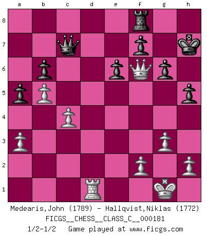Last move : 1/2-1/2 2011 October 23 9:2:46 [Event "FICGS__CHESS__CLASS_C__000181"] [Site "FICGS"] [Date "2011.09.11"] [Round "1"] [White "Medearis,John"] [Black "Hallqvist,Niklas"] [Result "1/2-1/2"] [WhiteElo "1789"] [BlackElo "1772"] 1.e4 e6 2.d4 d5 3.exd5 Qxd5 4.Nf3 Nf6 5.Bd3 c5 6.Nc3 Qd8 7.O-O cxd4 8.Nxd4 Be7 9.Be3 Bd7 10.Qe2 a6 11.Ne4 Qc7 12.Rad1 Nd5 13.Bg5 Nc6 14.Nxc6 Bxg5 15.Nb8 Rxb8 16.Nxg5 Bc6 17.g3 Nf6 18.Nf3 O-O 19.Ne5 Rfd8 20.c4 b6 21.Bc2 Ba8 22.b4 g6 23.Rfe1 Rxd1 24.Rxd1 a5 25.b5 Ne4 26.Bxe4 Qxe5 27.Bf3 Qc7 28.Bxa8 Rxa8 29.a3 Rc8 30.Qe3 h5 31.Qc3 Kh7 32.Qf6 Rf8 1/2-1/2 French : Exchange variation Kingside Castling by player White (move 7) Kingside Castling by player Black (move 18) This chess game ended in a draw. Follow this game move after move (download)When the Chess game is over, the Pawn and the King go back to the same box. (Irish saying) Ich bewundere Kasparows phantasievolle Angriffssiege aus den Achtzigern und Neunzigern, aber wenn man sie mit dem Computer überprüft, nimmt der Computer in jeder zweiten Partie die Opfer an, verteidigt sich und gewinnt. (Vladimir Kramnik) Los problemas de Ajedrez exigen del compositor las mismas virtudes que caracterizan todo el arte de valor: originalidad, invención, concisión, armonía, complejidad e insinceridad explendida. (Vladimir Nabokov) Soyez une menace à chaque fois que vous vous asseyez pour jouer. (Ken Smith) Life is like a play: it's not the length but the excellence of the acting that matters. (Seneca)