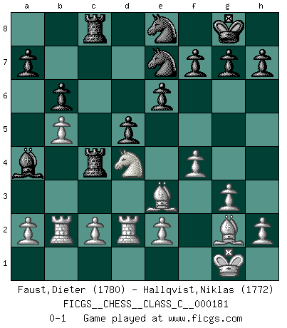 Last move : 0-1 2011 October 5 10:52:22 [Event "FICGS__CHESS__CLASS_C__000181"] [Site "FICGS"] [Date "2011.09.11"] [Round "1"] [White "Faust,Dieter"] [Black "Hallqvist,Niklas"] [Result "0-1"] [WhiteElo "1780"] [BlackElo "1772"] 1.d4 e6 2.Nf3 c5 3.g3 Nf6 4.Bg2 cxd4 5.O-O Qb6 6.Nxd4 Nc6 7.Nb3 d5 8.Na3 Bxa3 9.bxa3 O-O 10.Qd3 Ne5 11.Qc3 Ng6 12.Rb1 Bd7 13.Be3 Qd6 14.Qb4 Qxb4 15.axb4 b6 16.f4 Rac8 17.Nd4 Rc4 18.Rfd1 Ba4 19.Rb2 Rfc8 20.Rd2 Ne7 21.b5 Ne8 0-1 Queen's pawn Kingside Castling by player White (move 5) Kingside Castling by player Black (move 9) Player Black won this chess game. Follow this game move after move (download)Look at Garry Kasparov. After he loses, invariably he wins the next game. He just kills the next guy. That's something that we have to learn to be able to do. (Maurice Ashley) Über Karpov: Er war und ist ein Vertreter der russischen Reaktionäre. Das steckt tief in seiner Seele, wehalb ich nicht nett mit ihm umgehen kann. (Viktor Kortschnoi) ¿Se han dado cuenta de que Fischer casi nunca ha tenido piezas malas? El las intercambia y las piezas malas se quedan con sus oponenets. (Yuri Balashov) Le plus grand jeu de l'esprit jamais inventé, plus vous l'apprenez, plus vous y prenez du plaisir. (Garry Kasparov) Fame, I have already. Now I need the money. (an elderly Steinitz)