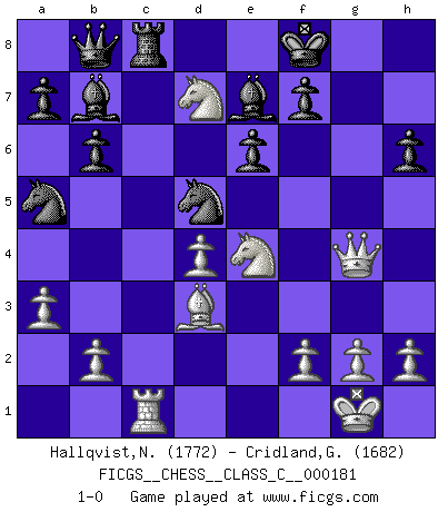 Last move : 1-0 2011 October 21 23:15:42 [Event "FICGS__CHESS__CLASS_C__000181"] [Site "FICGS"] [Date "2011.09.11"] [Round "1"] [White "Hallqvist,Niklas"] [Black "Cridland,Graham"] [Result "1-0"] [WhiteElo "1772"] [BlackElo "1682"] 1.e4 c5 2.c3 e6 3.d4 d5 4.Nd2 dxe4 5.Nxe4 cxd4 6.cxd4 Nf6 7.Nc3 Be7 8.Nf3 O-O 9.Bd3 b6 10.Be3 Bb7 11.O-O Nc6 12.a3 Rc8 13.Rc1 Nd5 14.Qc2 h6 15.Qe2 Bf6 16.Ne4 Be7 17.Rc2 Na5 18.Rxc8 Qxc8 19.Rc1 Qb8 20.Ne5 Rc8 21.Bxh6 gxh6 22.Qg4+ Kf8 23.Nd7+ 1-0 Sicilian : Alapin's variation (2.c3) Kingside Castling by player Black (move 8) Kingside Castling by player White (move 11) Player White won this chess game. Follow this game move after move (download)Later, I began to succeed in decisive games. Perhaps because I realized a very simple truth: not only was I worried, but also my opponent. (Mikhail Tal) Schachspieler können ausgezeichnet Varianten am Schachbrett berechnen, aber nicht im realen Leben. Zu stark ist der Individualismus im Schach ausgeprägt, und für viele ist ein kleiner momentaner persönlicher Vorteil wichtiger als ein weit größerer Vorteil von morgen. (Anatoly Karpov) El Ajedrez era la lengua materna de Capablanca. (Reti) Mon pion favori sur ma case favorite ! Bronstein en parlant d'un coup de pion en h5 quand il avait les Noirs. The message for business people contemplating their place in the cyberspace is simple and direct: get linked or get lost. (Vic Sussman and Kenan Pollack)