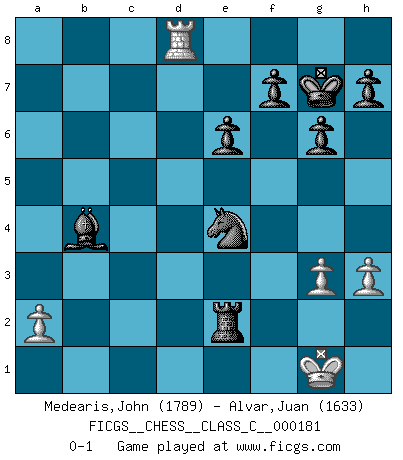Last move : 0-1 2012 February 27 0:17:39 [Event "FICGS__CHESS__CLASS_C__000181"] [Site "FICGS"] [Date "2011.09.11"] [Round "1"] [White "Medearis,John"] [Black "Alvar,Juan"] [Result "0-1"] [WhiteElo "1789"] [BlackElo "1633"] 1.e4 d6 2.Nc3 Nf6 3.Nf3 g6 4.Be2 c5 5.O-O Bg7 6.d4 cxd4 7.Nxd4 O-O 8.Be3 Nc6 9.Qd2 a6 10.Nxc6 bxc6 11.h3 Rb8 12.Rab1 c5 13.Rfd1 Bb7 14.e5 dxe5 15.Bxc5 Qc7 16.b4 Rfd8 17.Qe3 Ne8 18.Rxd8 Qxd8 19.Rd1 Qc7 20.Nd5 Bxd5 21.Rxd5 e6 22.Rd2 Nf6 23.Rd6 Nd5 24.Qd3 a5 25.c3 e4 26.Qc4 Nxc3 27.Bf1 axb4 28.Bxb4 Qxc4 29.Bxc4 Rxb4 30.Rd8+ Bf8 31.Rc8 Kg7 32.g3 Rb1+ 33.Kg2 Bb4 34.Ba6 Rb2 35.Bc4 e3 36.Ra8 Rxf2+ 37.Kg1 Ne4 38.Rd8 e2 39.Bxe2 Rxe2 0-1 King's pawn Opening Kingside Castling by player White (move 5) Kingside Castling by player Black (move 7) Player Black won this chess game. Follow this game move after move (download)Chess books should be used as we use glasses: to assist the sight, although some players make use of them as if they thought they conferred sight. (Jose Raul Capablanca) Sie führen leise Selbstgespräche, schlürfen lautstark ihre Getränke, schmatzen hörbar beim Essen, blasen ihrem Gegenüber Rauch in die Augen, niesen ihm ins Gesicht, starren ihn unverwandt an, bis er sich unter ihren Blicken windet, rutschen ständig auf ihrem Stuhl hin und her, rülpsen und bohren in der Nase. (Anonymous) El Jaque al descubierto es el bombardero del tablero. (Reuben Fine) Un journaliste : 'Vous préférez avoir une dame de plus sur l'échiquier ou au lit ?' Boris Spassky : 'Ca dépend de la position.' 'preceded by its own quotation yields a falsehood' preceded by its own quotation yields a falsehood. (W. V. O. Quine - Set Theory And Its Logic, 1953)