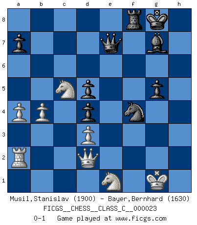 Last move : 0-1 2007 April 16 15:11:0 [Event "FICGS__CHESS__CLASS_C__000023"] [Site "FICGS"] [Date "2007.01.03"] [Round "1"] [White "Musil,Stanislav"] [Black "Bayer,Bernhard"] [Result "0-1"] [WhiteElo "1900"] [BlackElo "1630"] 1.c4 Nf6 2.Nc3 e5 3.Nf3 Nc6 4.a3 g6 5.g3 Bg7 6.Bg2 O-O 7.O-O Re8 8.e4 d6 9.d3 h6 10.b4 Be6 11.Bd2 Nd7 12.h3 Ne7 13.Be3 f5 14.a4 c6 15.Qd2 g5 16.exf5 Nxf5 17.g4 Nd4 18.Bxd4 exd4 19.Ne4 Nf8 20.Rfe1 Ng6 21.c5 dxc5 22.Nxc5 Bd5 23.Rxe8+ Qxe8 24.Nxb7 Qf8 25.Ne1 Nf4 26.Bxd5+ cxd5 27.Nc5 Re8 28.Ra2 h5 29.Kf1 Nxh3 30.gxh5 Qd6 31.f4 Nxf4 32.Qh2 Qe7 33.Qf2 Nxh5 34.Qd2 Rf8+ 35.Kg1 Nf4 0-1 English Opening Kingside Castling by player Black (move 6) Kingside Castling by player White (move 7) Player Black won this chess game. Follow this game move after move (download)Via the squares on the chessboard, the Indians explain the movement of time and the age, the higher influences which control the world and the ties which link Chess with the human soul. (Al-Masudi) Charakterschwächen offenbaren sich normalerweise während einer Schachpartie. (Garry Kasparov) Las combinaciones han sido siempre el aspecto más intrigante del Ajedrez. Los Maestros las buscan, el público las aplauden, los críticos las alaban. La razón se debe a que las combinaciones hacen posible que el Ajedrez sea más que un ejercicio matemático con una carencia de vida. Ellas son la poesía del juego, son del Ajedrez lo que la melodía es de la música. Ellas representan el triunfo de la mente sobre la materia. (Reuben Fine) Les Echecs représentent une sphère d'idées créatrices basée sur la volonté des deux protagonistes. (Smyslov) Hold em is to stud what chess is to checkers. (Johnny Moss)