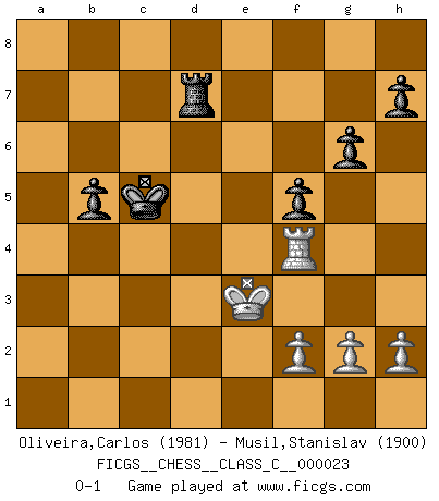 Last move : 0-1 2007 March 7 20:12:44 [Event "FICGS__CHESS__CLASS_C__000023"] [Site "FICGS"] [Date "2007.01.03"] [Round "1"] [White "Oliveira,Carlos"] [Black "Musil,Stanislav"] [Result "0-1"] [WhiteElo "1981"] [BlackElo "1900"] 1.d4 Nf6 2.c4 e6 3.Nc3 Bb4 4.e3 O-O 5.Nf3 d5 6.Qc2 c5 7.cxd5 cxd4 8.exd4 exd5 9.Be2 Bg4 10.O-O Nc6 11.Bg5 Bxf3 12.Bxf3 Nxd4 13.Qd3 Bxc3 14.bxc3 Nxf3 15.Qxf3 Rc8 16.Bxf6 Qxf6 17.Qxd5 Rc7 18.Qd4 Qxd4 19.cxd4 Rd8 20.Rfd1 Rc4 21.Rac1 Rd8xd4 22.Kf1 Kf8 23.Rxc4 Rxd1 24.Ke2 Rd7 25.Ra4 a6 26.Rb4 Ke7 27.a4 Kd6 28.Rg4 f5 29.Rh4 g6 30.Rf4 Kc5 31.Ke3 b5 32.axb5 axb5 0-1 Nimzo-Indian : 4.e3 e8g8, 5.Nf3 d7d5 Kingside Castling by player Black (move 4) Kingside Castling by player White (move 10) Player Black won this chess game. Follow this game move after move (download)Discovered check is the dive bomber of the Chessboard. (Reuben Fine) Es war undenkbar für die Behörden, dass ein sowjetischer Großmeister auf diese Art und Weise [Fischer-Taimanov 6:0] verliert, ohne dass es eine politischer Erklärung dafür gäbe. (Mark Taimanov) Yo siempre he tenido un ligero sentimiento de lástima por una persona que no tiene conocimiento del Ajedrez. (Siegbert Tarrasch) Même un GMI sait rarement calculer sur plus de cinq coups une attaque à sacrifices. (Rudolf Spielmann) Luck is what you have left over after you give 100 percent. (Langston Coleman)