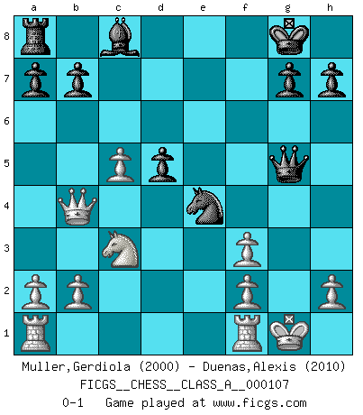 Last move : 0-1 2011 September 29 16:45:46 [Event "FICGS__CHESS__CLASS_A__000107"] [Site "FICGS"] [Date "2011.09.12"] [Round "1"] [White "Muller,Gerdiola"] [Black "Duenas,Alexis"] [Result "0-1"] [WhiteElo "2000"] [BlackElo "2010"] 1.e4 e5 2.Nf3 Nc6 3.d4 exd4 4.Bc4 Bc5 5.c3 Nf6 6.cxd4 Bb4+ 7.Bd2 Nxe4 8.Bxb4 Nxb4 9.Bxf7+ Kxf7 10.Qb3+ d5 11.Qxb4 Rf8 12.O-O Kg8 13.Nc3 c5 14.dxc5 Rxf3 15.gxf3 Qg5+ 0-1 Scotch gambit Kingside Castling by player White (move 12) Player Black won this chess game. Follow this game move after move (download)I look one move ahead... the best ! (Siegbert Tarrasch) Ich möchte Schüler heranbilden, die das Vermögen haben, selbst zu denken und Kritik zu üben. (Emanuel Lasker) Bobby Fischer es el mas grande genio de Ajedrez de todos los tiempos. (Alexander Kotov) Une platitude souvent récitée à propos des Echecs est qu'une des choses les plus difficiles à réaliser est de gagner une position gagnante. Cela ne manque pas de sens mais, pour ma part, j'ai toujours trouvé plus difficile de gagner une position perdante. (Tim Krabbe) Logic : The art of thinking and reasoning in strict accordance with the limitations and incapacities of the human misunderstanding. (Ambrose Bierce)