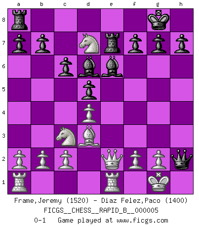 Last move : 0-1 2006 May 26 20:38:9 [Event "FICGS__CHESS__RAPID_B__000005"] [Site "FICGS"] [Date "2006.05.10"] [Round "1"] [White "Frame,Jeremy"] [Black "Diaz Felez,Paco"] [Result "0-1"] [WhiteElo "1520"] [BlackElo "1400"] 1.e4 e6 2.d4 d5 3.exd5 exd5 4.Nf3 Nf6 5.Nc3 Bd6 6.Bg5 c6 7.Be2 O-O 8.O-O Re8 9.Re1 Be6 10.Bxf6 Qxf6 11.Bd3 Nd7 12.Qe2 Re7 13.Ne5 Qh6 14.Nxd7 Qxh2+ 0-1 French : Exchange variation Kingside Castling by player Black (move 7) Kingside Castling by player White (move 8) Player Black won this chess game. Follow this game move after move (download)Who is your opponent tonight, tonight I am playing against the Black pieces. (Akiba Rubinstein) Zum Sieg gelangt man nicht, wenn man gut, sondern nur wenn man besser spielt (Savielly Grigorievitsch Tartakower) Si pudieramos observar el interior de la cabeza de un jugador de Ajedrez, encontraríamos ahí un mundo lleno de sentimientos, imágenes, ideas, emoción y pasión. (Alfred Binet) On croit qu'il y a plus de mauvais joueurs que de bons joueurs, c'est faux : Il y a autant de joueurs qui gagnent que de joueurs qui perdent. (Philippe Geluck) The weakness of an artist is dogma. (Josh Waitzkin)