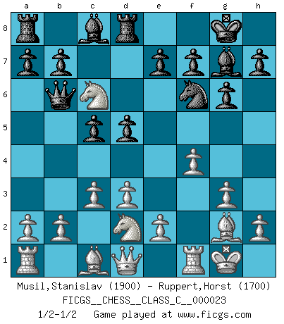 Last move : 1/2-1/2 2007 January 9 14:3:18 [Event "FICGS__CHESS__CLASS_C__000023"] [Site "FICGS"] [Date "2007.01.03"] [Round "1"] [White "Musil,Stanislav"] [Black "Ruppert,Horst"] [Result "1/2-1/2"] [WhiteElo "1900"] [BlackElo "1700"] 1.f4 d5 2.Nf3 g6 3.g3 Bg7 4.Bg2 Nf6 5.O-O O-O 6.c3 c5 7.d3 Nc6 8.Ne5 Qb6 9.Nd2 Rd8 10.Nxc6 1/2-1/2 Bird's Opening Kingside Castling by player White (move 5) Kingside Castling by player Black (move 5) This chess game ended in a draw. Follow this game move after move (download)Chess is a sea in which a gnat may drink and an elephant may bathe. (Hindu proverb) Ich möchte Schüler heranbilden, die das Vermögen haben, selbst zu denken und Kritik zu üben. (Emanuel Lasker) Las ideas audaces son como las piezas del Ajedrez que avanzan hacia adelante. Ellas pueden ser vencidas, pero también pueden iniciar una partida victoriosa. (Goethe) Psychologiquement, tu dois avoir confiance en toi même, mais cette confiance doit être basée sur des faits. (Robert Fischer) Perhaps the current trend of many chess professionals taking up the more lucrative pastime of poker is not a wholly negative one. It may not be too late for humans to relearn how to take risks in order to innovate and thereby maintain the advanced lifestyles we enjoy. And if it takes a poker-playing supercomputer to remind us that we can't enjoy the rewards without taking the risks, so be it. (The Chess Master and the Computer, by Garry Kasparov - 2010)