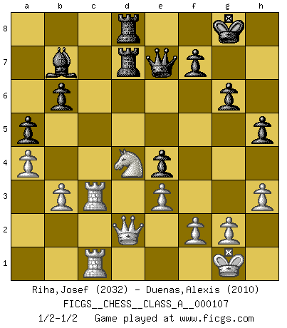 Last move : 1/2-1/2 2011 October 5 12:16:1 [Event "FICGS__CHESS__CLASS_A__000107"] [Site "FICGS"] [Date "2011.09.12"] [Round "1"] [White "Riha,Josef"] [Black "Duenas,Alexis"] [Result "1/2-1/2"] [WhiteElo "2032"] [BlackElo "2010"] 1.d4 d5 2.Nf3 Nf6 3.c4 e6 4.Nc3 Be7 5.Bg5 h6 6.Bh4 O-O 7.e3 b6 8.Rc1 Bb7 9.Be2 Nbd7 10.cxd5 exd5 11.O-O Ne4 12.Bxe7 Qxe7 13.Qb3 Nxc3 14.Rxc3 c5 15.dxc5 Nxc5 16.Qb4 Qe4 17.Nd4 Qg6 18.Qa3 a5 19.Rfc1 Rac8 20.h3 Qf6 21.Bg4 Rb8 22.b3 Ra8 23.Qb2 g6 24.a3 h5 25.Bf3 Rfd8 26.Qe2 Rd7 27.R3c2 Qd6 28.Qd1 Ne4 29.Bxe4 dxe4 30.a4 Rad8 31.Qe2 Qe5 32.Rc3 Kh7 33.Qc2 Qe7 34.Rc7 Qd6 35.Qc4 Bd5 36.Qc3 Bb7 37.Kh1 Qf6 38.Kg1 Qd6 39.Qc2 Qe7 40.Rc3 Qe5 41.Rc4 Kg8 42.Rc7 Qd6 43.Qc4 Bd5 44.Qc3 Bb7 45.Rc4 Qe7 46.Qd2 Bd5 47.R4c3 Bb7 1/2-1/2 Queen's pawn game Kingside Castling by player Black (move 6) Kingside Castling by player White (move 11) This chess game ended in a draw. Follow this game move after move (download)The tactician knows what to do when there is something to do; whereas the strategian knows what to do when there is nothing to do. (Gerald Abrahams) Schach verlangt totale Konzentration. (Robert James Fischer) En un gambito tu regalas un Peón por el bién de tomar un juego perdido. (Samuel Standige Boden) Ne tendez aucun piège pour le plaisir ! Ne jouez rien dans l'espoir que l'adversaire réagisse de façon stupide ! Prenez toujours pour acquis que l'adversaire va trouver le meilleur coup ! Ne jouez jamais de coup dans l'espoir que l'adversaire ne voie pas la menace ! Chacun de vos coups doit améliorer la position d'une façon ou d'une autre. Whenever people agree with me, I always feel I must be wrong. (Oscar Wilde)