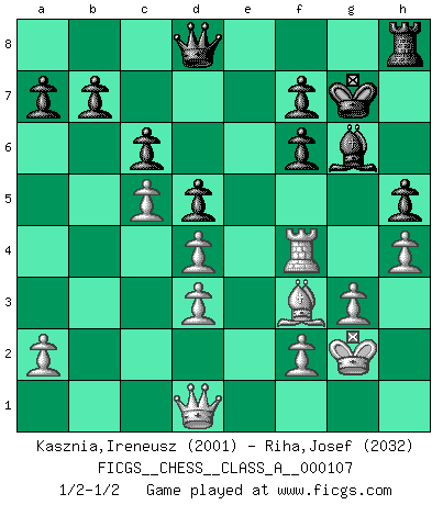 Last move : 1/2-1/2 2011 September 23 21:6:32 [Event "FICGS__CHESS__CLASS_A__000107"] [Site "FICGS"] [Date "2011.09.12"] [Round "1"] [White "Kasznia,Ireneusz"] [Black "Riha,Josef"] [Result "1/2-1/2"] [WhiteElo "2001"] [BlackElo "2032"] 1.c4 e5 2.Nc3 Nf6 3.Nf3 Nc6 4.g3 Bb4 5.Bg2 O-O 6.O-O Re8 7.d3 Bxc3 8.bxc3 e4 9.Nd4 exd3 10.exd3 Nxd4 11.cxd4 d5 12.Bf4 c6 13.Qd2 Bf5 14.Rae1 Qd7 15.Bg5 Rxe1 16.Rxe1 Re8 17.Re3 Be6 18.c5 Qd8 19.Rf3 Bg4 20.Bxf6 gxf6 21.Rf4 Bh5 22.Bf3 Bg6 23.h4 h5 24.Kg2 Kg7 25.Qd1 Rh8 26.Qc2 Qe7 27.Qd1 Qd8 1/2-1/2 English Opening Kingside Castling by player Black (move 5) Kingside Castling by player White (move 6) This chess game ended in a draw. Follow this game move after move (download)On the chessboard, lies and hypocrisy do not survive long. (Emanuel Lasker) Es gibt nur zwei wahre Schachgenies - das andere war Wilhelm Steinitz, der Weltmeister von 1872 bis 1894. (Robert James Fischer) No hay otro maestro que tenga una voluntad terrífica de ganar. Al tablero, el irradía peligro y aún los oponentes mas fuertes tienden a congelarse como liebres cuando olfatean a una pantera. Aún sus debilidades son peligrosas. Con las blancas, su juego de apertura es predecible - te es posible hacer planes en su contra - pero es tan fuerte que tus planes casi nunca funcionan. En el juego medio, su precisión e invención son fabulosas y en finales, tú simplemente no le puedes vencer. (Experto Alemán anónimo) Les échecs sont un jeu par leur forme, un art par leur essence et une science par sa difficulté d'acquisition. Ils peuvent vous procurer autant de plaisir qu'un bon livre ou une belle musique, mais vous n'aurez une réelle joie que si vous arrivez à bien jouer. (Tigran Petrosian) There are two types of people in this world, good and bad. The good sleep better, but the bad seem to enjoy the waking hours much more. (Woody Allen)