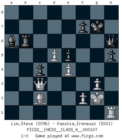 Last move : 1-0 2012 March 17 14:50:57 [Event "FICGS__CHESS__CLASS_A__000107"] [Site "FICGS"] [Date "2011.09.12"] [Round "1"] [White "Lim,Steve"] [Black "Kasznia,Ireneusz"] [Result "1-0"] [WhiteElo "2096"] [BlackElo "2001"] 1.d4 Nf6 2.c4 g6 3.Nc3 Bg7 4.e4 d6 5.Nf3 O-O 6.h3 e5 7.d5 Nbd7 8.Bd3 Nc5 9.Bc2 a5 10.O-O b6 11.Be3 Ba6 12.b3 Nh5 13.a3 Nf4 14.Rb1 h6 15.Re1 Qe7 16.Kh2 Nh5 17.g3 Ra7 18.b4 Nd7 19.bxa5 Bxc4 20.Rb4 Ba6 21.axb6 cxb6 22.Na4 Rc7 23.Nxb6 Nc5 24.a4 Nf6 25.Qd2 Rb8 26.Rc1 Qd8 27.Kg2 Bf8 28.a5 Qe7 29.Bb1 Rcb7 30.Bxh6 Bxh6 31.Qxh6 Be2 32.Nd2 Nfd7 33.Nb3 Nxb6 34.Nxc5 dxc5 35.Rxb6 Rxb6 36.axb6 Rxb6 37.Qe3 Ba6 38.Bc2 Qd6 39.h4 c4 40.h5 gxh5 41.Qg5+ Kf8 42.Rh1 Qf6 43.Qe3 Qh6 44.Qa3+ Kg7 45.Qc3 1-0 King's Indian : 5.Nf3 Kingside Castling by player Black (move 5) Kingside Castling by player White (move 10) Player White won this chess game. Follow this game move after move (download)No one ever won a game by resigning. (Unknown) Ich verstehe den Grund nicht, warum die Aufteilung in Frauen und Männer überhaupt im Schach besteht. (Judith Polgar) A través de las casillas del tablero, los Indios explican el movimiento del tiempo y la edad, las influencias mas altas que controlan el mundo y los lazos que vinculan al Ajedrez con el alma humana. (Al-Masudi) Les Echecs, c'est l'art de la guerre sans les charniers, c'est la résurrection des morts tombés au champ d'honneur, l'espoir perpétuel, la suprématie de l'intelligence sur la force, la culture de l'esprit. (F. Szpiner) You can't play chess if you're groggy from pills. (Anatoly Karpov)