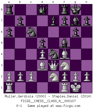 Last move : 0-1 2012 January 11 5:52:20 [Event "FICGS__CHESS__CLASS_A__000107"] [Site "FICGS"] [Date "2011.09.12"] [Round "1"] [White "Muller,Gerdiola"] [Black "Staples,Daniel"] [Result "0-1"] [WhiteElo "2000"] [BlackElo "2014"] 1.e4 c6 2.d4 d5 3.exd5 cxd5 4.Bd3 Nc6 5.Ne2 a6 6.O-O Nf6 7.Bf4 g6 8.Nd2 Bg7 9.Nf3 O-O 10.Qd2 Ne4 11.Qe3 Bf5 0-1 This chess game has been lost on time (started : 2011.09.12 21:27:9) Caro-Kann : Exchange variation Kingside Castling by player White (move 6) Kingside Castling by player Black (move 9) Player Black won this chess game. Follow this game move after move (download)Only sissies Castle. (Rob Sillars) Besser ein falscher Plan, logisch durchgeführt, als gar kein Plan. (Viktor Kortschnoi) La única cosa que los jugadores de Ajedrez tienen en común, es el Ajedrez. (Lodewijk Prins) Mais l'homme est une créature légère et illogique : semblable au joueur d'échecs, il n'aime que le processus du but à atteindre, non le but lui-même. (Dostoïevsky) The ego is not master in its own house. (Sigmund Freud)