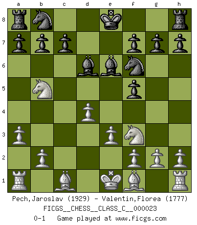 Last move : 0-1 2007 February 21 0:20:18 [Event "FICGS__CHESS__CLASS_C__000023"] [Site "FICGS"] [Date "2007.01.03"] [Round "1"] [White "Pech,Jaroslav"] [Black "Valentin,Florea"] [Result "0-1"] [WhiteElo "1929"] [BlackElo "1777"] 1.d4 Nf6 2.c4 e6 3.Nc3 Bb4 4.Qc2 d5 5.cxd5 Qxd5 6.Nf3 Qf5 7.Qxf5 exf5 8.a3 Bd6 9.Nb5 Be6 10.e3 0-1 Nimzo-Indian : Classical, Noa variation Player Black won this chess game. Follow this game move after move (download)We don't really know how the game was invented, though there are suspicions. As soon as we discover the culprits, we'll let you know. (Bruce Pandolfini) Ich spiele 70 Eröffnungssysteme. (Viktor Kortschnoi) Una partida de Ajedrez se divide en 3 etapas: la primera cuando piensas que tienes la ventaja, la segunda cuando crees que tienes la ventaja y la tercera... ¡cuando te das cuenta que vas a perder!. (Savielly Tartakower) Botvinnik disait en comparant les échecs à la musique: Il existe une science dont le but est l'étude de l'acoustique et des sons. Mais il y a aussi un art qui se sert de l'océan des sons : c'est la musique. De toute évidence, il en est de même pour la pensée. La logique est l'étude des lois de la réflexion et les échecs reflètent, en tant qu'art, le côté logique de la réflexion, sous la forme d'images artistiques... Extrait de Fischer - Spassky, Reykjavik 1972 par Alexander & F. Wyndham (Ed. Solar), p 37. Experience is the name we all give to our mistakes. (Oscar Wilde)