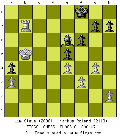 Last move : 1-0 2012 April 15 19:45:16 [Event "FICGS__CHESS__CLASS_A__000107"] [Site "FICGS"] [Date "2011.09.12"] [Round "1"] [White "Lim,Steve"] [Black "Markus,Roland"] [Result "1-0"] [WhiteElo "2096"] [BlackElo "2113"] 1.d4 e6 2.Nf3 Nf6 3.c4 d5 4.g3 c6 5.Bg2 dxc4 6.Ne5 Bb4+ 7.Bd2 Be7 8.e3 c5 9.dxc5 Qc7 10.Nxc4 Qxc5 11.Qe2 O-O 12.a3 Qc7 13.Ba5 Qc5 14.Bc3 Nd5 15.O-O Nc6 16.Rd1 Rd8 17.b4 Qb5 18.Bf1 Qa6 19.Bb2 b5 20.e4 Nc7 21.Rxd8+ Nxd8 22.Na5 Nc6 23.Qc2 Bd7 24.Nd2 Rc8 25.Qd3 Be8 26.Nxc6 Qxc6 27.Nb3 f6 28.Rc1 Qd7 29.Qe3 a6 30.Bh3 Na8 31.Nc5 Bxc5 32.bxc5 Nc7 33.c6 Qe7 34.Qb6 Bh5 35.Qb7 Re8 36.Ra1 Bg6 37.Bg2 e5 38.Bc3 Ne6 39.Qxe7 Rxe7 40.Ba5 Nc7 41.f3 Be8 42.Rd1 Kf7 43.Bb4 Ne6 44.Bxe7 Kxe7 45.Bh3 Bxc6 46.Bxe6 Kxe6 47.Rd8 a5 48.Kf2 a4 49.g4 Ke7 50.Rg8 Kf7 51.Rb8 Ke7 52.Ke3 Ke6 53.Kd3 Bd7 54.Kc3 Ke7 55.Kb4 Be6 56.Rb7+ Kf8 57.Kxb5 1-0 Comment by player 1 : Steve Lim : 43. Bb4?? Queen's pawn Kingside Castling by player Black (move 11) Kingside Castling by player White (move 15) Player White won this chess game. Follow this game move after move (download)Excellence at Chess is one mark of a scheming mind. (Sir Arthur Conan Doyle) Jeder Fehler erscheint unglaublich dumm, wenn andre ihn begehen. (Georg Christoph Lichtenberg) El Ajedrez es el arte del análisis. (Mikhail Botvinnik) L'attaque fait le spectacle, la défense gagne les matchs. (Dicton footballistique) There is no vagueness without wind. (Chinese proverb)
