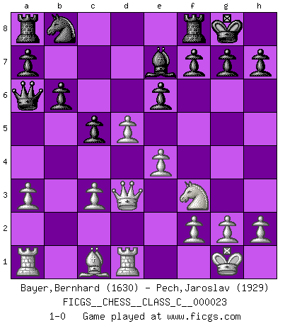 Last move : 1-0 2007 March 3 14:53:52 [Event "FICGS__CHESS__CLASS_C__000023"] [Site "FICGS"] [Date "2007.01.03"] [Round "1"] [White "Bayer,Bernhard"] [Black "Pech,Jaroslav"] [Result "1-0"] [WhiteElo "1630"] [BlackElo "1929"] 1.d4 Nf6 2.c4 e6 3.Nf3 b6 4.a3 Bb7 5.Nc3 d5 6.cxd5 Nxd5 7.Qc2 Nxc3 8.bxc3 Be7 9.e4 O-O 10.Bd3 c5 11.O-O Qc8 12.Qe2 Ba6 13.Rd1 Bxd3 14.Qxd3 Qa6 15.d5 1-0 Queen's Indian : Petrosian system Kingside Castling by player Black (move 9) Kingside Castling by player White (move 11) Player White won this chess game. Follow this game move after move (download)Fischer is the strongest player in the world. In fact, the strongest player who ever lived. (Larry Evans) Wenn ich gewinne bin ich ein Genie. Wenn nicht, dann bin ich keines. (Robert James Fischer) ¿Porque tengo que perder ante este idiota?. (Aron Nimzovich) Je fais ceci parce que dans cinquante coups j'obtiendrai cela; je m'appelle Mikhail Moisevitch Botvinnik. (Botvinnik) Wawaweewa ! (Borat: Cultural learnings of America for make benefit glorious nation of Kazakhstan)