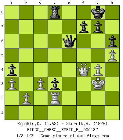 Last move : 1/2-1/2 2012 January 2 21:49:56 [Event "FICGS__CHESS__RAPID_B__000187"] [Site "FICGS"] [Date "2011.09.13"] [Round "1"] [White "Ropokis,Dimitrios"] [Black "Sternik,Ryszard"] [Result "1/2-1/2"] [WhiteElo "1763"] [BlackElo "1825"] 1.e4 c6 2.f4 d5 3.Nf3 dxe4 4.Ng5 Nf6 5.Bc4 e6 6.Nc3 b5 7.Bb3 a5 8.a3 a4 9.Ba2 Qd6 10.Ncxe4 Nxe4 11.Nxe4 Qxf4 12.d3 Qf5 13.g4 Qe5 14.O-O Qd4+ 15.Kg2 Be7 16.Qf3 O-O 17.Bg5 Qd8 18.h4 Nd7 19.Rae1 Bb7 20.Nd6 Ne5 21.Rxe5 Qxd6 22.Bxe7 Qxe5 23.Kh3 Rae8 24.Bxf8 Rxf8 25.c3 Qd6 26.d4 Qd7 27.h5 c5 28.Bxe6 Qxe6 29.Qxb7 cxd4 30.Qxb5 Qe3+ 31.Kg2 Qe4+ 32.Kg3 d3 33.Qf5 Qe3+ 34.Qf3 Qe5+ 35.Qf4 Qe7 36.Rf2 h6 37.Rd2 Rd8 38.Qf3 Qe1+ 39.Qf2 Qe5+ 40.Qf4 Qe6 1/2-1/2 Caro-Kann defense Kingside Castling by player White (move 14) Kingside Castling by player Black (move 16) This chess game ended in a draw. Follow this game move after move (download)You know you're going to lose. Even when I was ahead I knew I was going to lose. - On playing against Fischer. (Andrew Soltis) Ich organisiere ein großes Turnier, was mich etwa 120000 Dollar kostet. Ich denke, das ist das erste Mal in der Schachgeschichte, daß ein Schachgroßmeister auch als Mäzen auftritt. (Miguel Najdorf) Yo no creo en la psicología. Yo creo en las buenas movidas. (Bobby Fischer) Echiquier : carré parfait, comme la Jérusalem nouvelle décrite par l'auteur de l'Apocalypse, huit cases sur huit, exaltation du chiffre 4, symbole du cosmos aux quatre horizons... où le noir et le blanc, l'ombre et la lumière, le mal et le bien s'entremêlent et se conjuguent. (Robert Couffignal, Le Gambit du poète) History is the quarrels of popes and kings, with wars or pestilences in every page; the men all so good for nothing, and hardly any women at all. (Jane Austen)