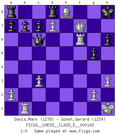 Last move : 1-0 2012 January 30 21:3:12 [Event "FICGS__CHESS__CLASS_E__000142"] [Site "FICGS"] [Date "2011.09.14"] [Round "1"] [White "Davis,Mark"] [Black "Gonet,Gerard"] [Result "1-0"] [WhiteElo "1278"] [BlackElo "1224"] 1.e4 e5 2.Nf3 d5 3.exd5 Bd6 4.Nc3 Nf6 5.d3 Bg4 6.Be2 O-O 7.Bg5 Re8 8.O-O h6 9.Bh4 g5 10.Bg3 Nbd7 11.Re1 Nh5 12.Ne4 Ndf6 13.Nxf6+ Qxf6 14.h3 Nxg3 15.fxg3 e4 16.dxe4 Bxg3 17.Rf1 Bd7 18.Nd4 Qg6 19.Nf5 Bxf5 20.exf5 Qb6+ 21.Kh1 Be5 22.Rb1 Bd6 23.f6 Be5 24.c3 Bxf6 25.d6 Be5 26.d7 Red8 27.Bh5 f6 28.Be8 Bxc3 29.bxc3 Qc6 30.Qb3+ Kg7 31.Qf7+ Kh8 32.Rxf6 1-0 QP counter-gambit : Maroczy gambit Kingside Castling by player Black (move 6) Kingside Castling by player White (move 8) Player White won this chess game. Follow this game move after move (download)When I asked Fischer why he had not played a certain move in our game, he replied: 'Well, you laughed when I wrote it down !' (Mikhail Tal) Ein Springer auf f6 gegen die eigene Rochadestellung ist schlimmer als ein rostiger Nagel im Knie. (Efim Bogoljubov) Creo que una cierta cantidad de temperamento es esperada de los genios del Ajedrez. (Ron Gross) On entre au jeu d'Echecs comme on entre en Religion. Pour le joueur d'Echecs, la partie d'Echecs c'est l'office, la messe, le défilé du 1er Mai, le dépôt de gerbe au Monument aux Morts. C'est un drame sacré. (Michel Roos) Memory is a complicated thing, a relative to truth, but not its twin. (Barbara Kingsolver, Animal Dreams)