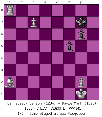 Last move : 1-0 2012 May 18 1:30:20 [Event "FICGS__CHESS__CLASS_E__000142"] [Site "FICGS"] [Date "2011.09.14"] [Round "1"] [White "Barradas,Anderson"] [Black "Davis,Mark"] [Result "1-0"] [WhiteElo "1284"] [BlackElo "1278"] 1.e4 c5 2.Nf3 Nc6 3.d4 cxd4 4.Nxd4 g6 5.Nc3 Bg7 6.Nxc6 bxc6 7.Bd3 Qa5 8.Bd2 Qb6 9.Rb1 d6 10.Be3 Qc7 11.Qf3 Nf6 12.O-O O-O 13.Bd4 e5 14.Be3 Bg4 15.Qg3 Qc8 16.h3 Nh5 17.Qxg4 Qxg4 18.hxg4 Nf6 19.Be2 Rfd8 20.g5 Nd7 21.Rbd1 Nb6 22.b3 Rac8 23.Ba6 Rc7 24.Bc5 Rcd7 25.Rd2 dxc5 26.Rxd7 Rxd7 27.a4 Rd6 28.a5 Nd7 29.Bc8 Nf8 30.Na4 Rd2 31.c4 h6 32.gxh6 Bxh6 33.Nxc5 Kg7 34.b4 Rc2 35.Ba6 Bd2 36.Rb1 Nh7 37.Nd7 Ng5 38.Nxe5 Kf6 39.Nxc6 Nxe4 40.Nxa7 Bc3 41.c5 Nxf2 42.Nc6 Ng4 43.Rf1+ Kg7 44.Bd3 Rd2 45.Bc4 Nh6 46.a6 Bd4+ 47.Nxd4 Rxd4 48.a7 Rd8 49.Ra1 Nf5 50.a8Q Rxa8 51.Rxa8 Ne3 52.Ba2 Nc2 53.b5 Nb4 54.c6 Nxc6 55.bxc6 f5 56.c7 1-0 This chess game has been lost on time (started : 2011.09.14 12:41:0) Sicilian : Accelerated Fianchetto, Modern variation Kingside Castling by player White (move 12) Kingside Castling by player Black (move 12) Promotion Queen by player White (move 50) 10 pieces endgame at move 51 : White KRBPPP , Black KNPP WHITE : King + 1 Rook 1 Bishop 3 Pawns BLACK : King + 1 Knight 2 Pawns 9 pieces endgame at move 54 : White KRBPP , Black KNPP WHITE : King + 1 Rook 1 Bishop 2 Pawns BLACK : King + 1 Knight 2 Pawns 8 pieces endgame at move 55 : White KRBPP , Black KPP WHITE : King + 1 Rook 1 Bishop 2 Pawns BLACK : King + 2 Pawns Player White won this chess game. Follow this game move after move (download)Half the variations which are calculated in a tournament game turn out to be completely superfluous. Unfortunately, no one knows in advance which half. (Jan Tinman) Eine Person mit durchschnittlichem IQ kann etwa eine ELO von 2000 erreichen. (Jonathan Levitt) Tu sabes que vas a perder. Aún cuando tenía la ventaja, yo sabía que iba a perder. - al estar jugando con Fischer (Andrew Soltis) Toute estimation doit être constamment réévaluée. (Jacob Estrin) The modern world has divided itself into Conservatives and Progressives. The business of Progressives is to go on making mistakes. The business of the Conservatives is to prevent the mistakes from being corrected. (G.K. Chesterton)